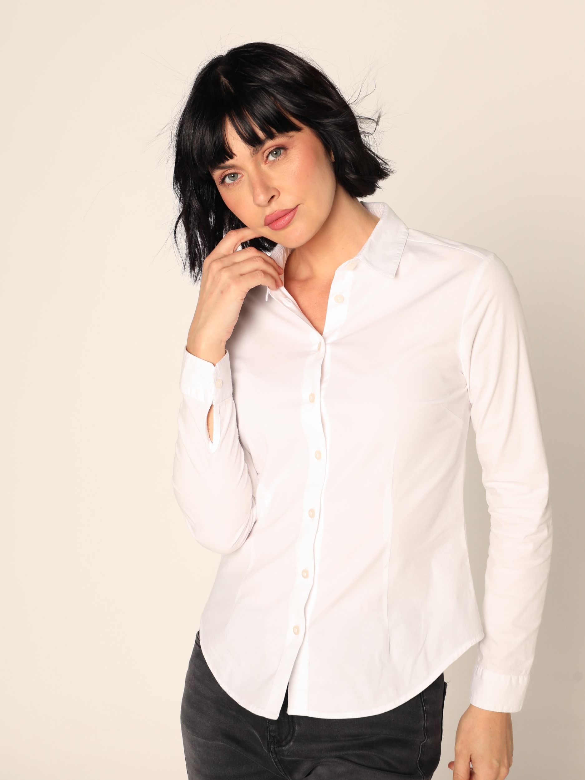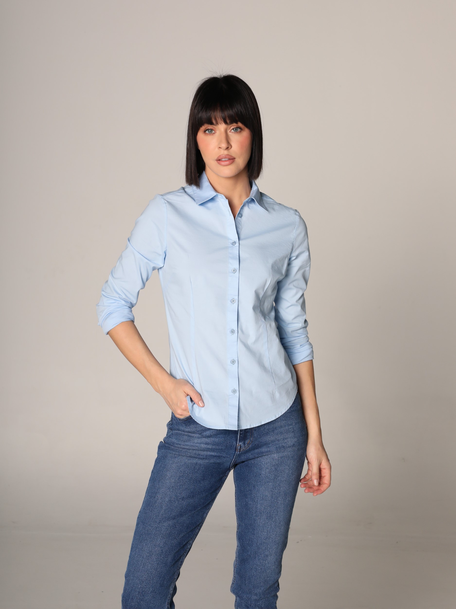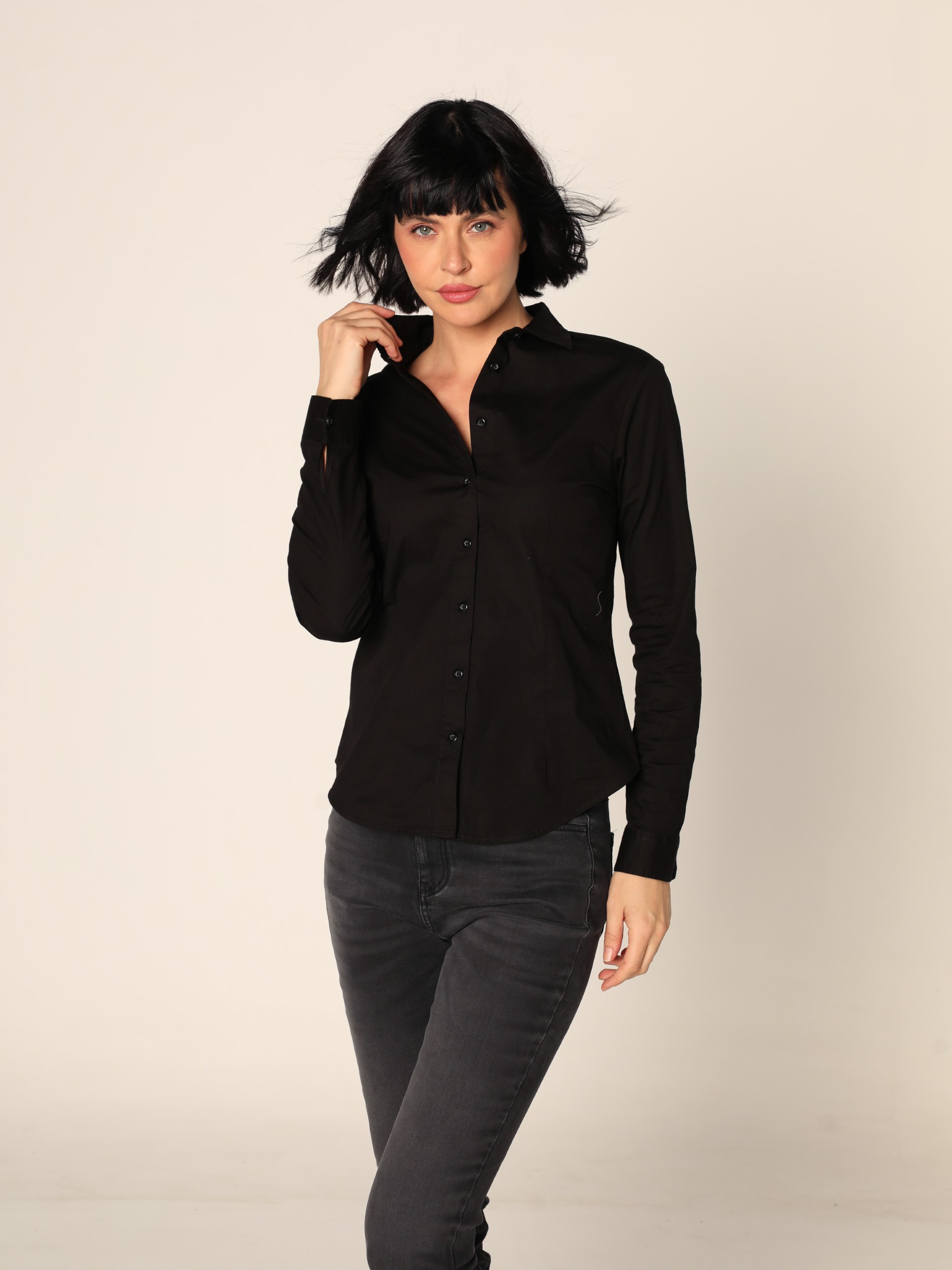 Klasična jednobojna bluza sa kragnom i kopčanjem celom dužinom na dugmiće. Dugi rukavi.