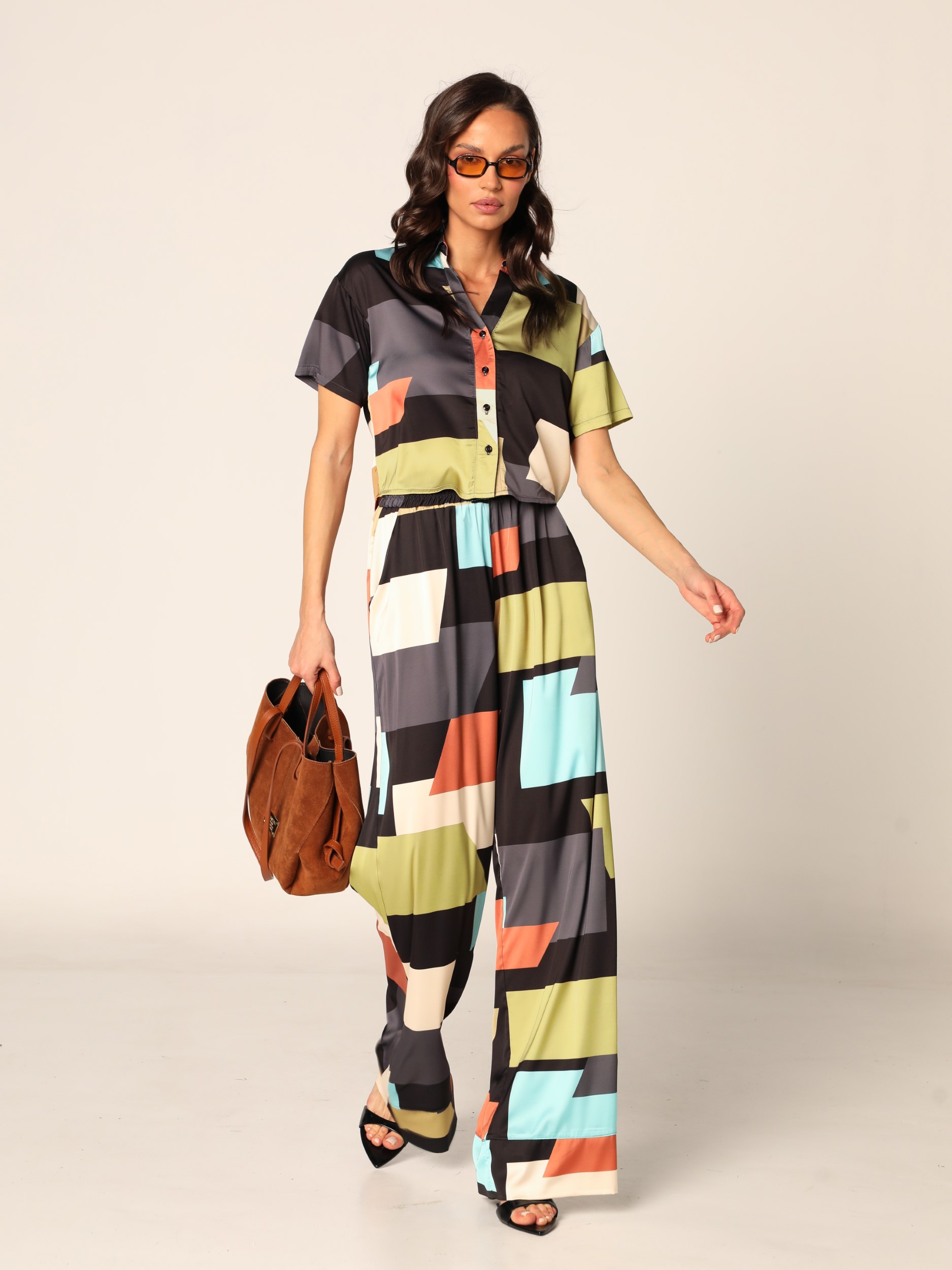 Kraća bluza sa kragnom i kopčanjem na dugmad duž prednje strane, kratkih rukava i spuštenih ramena, u geometrijskom printu.