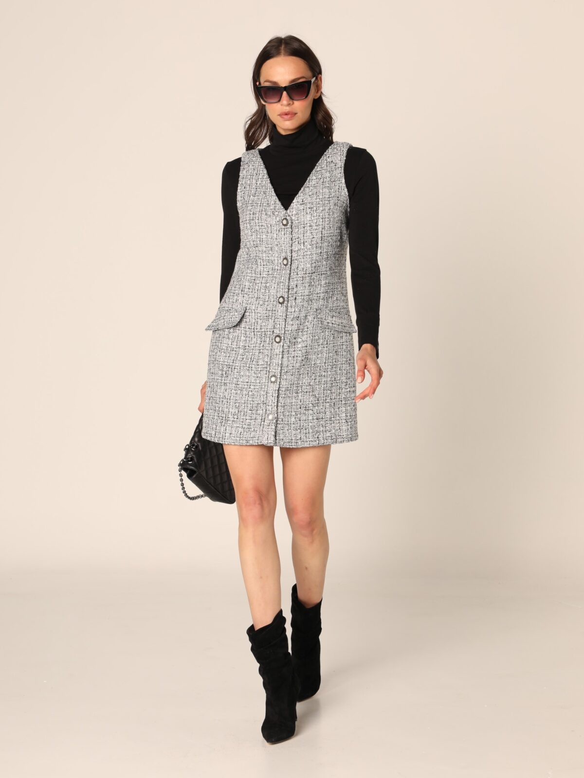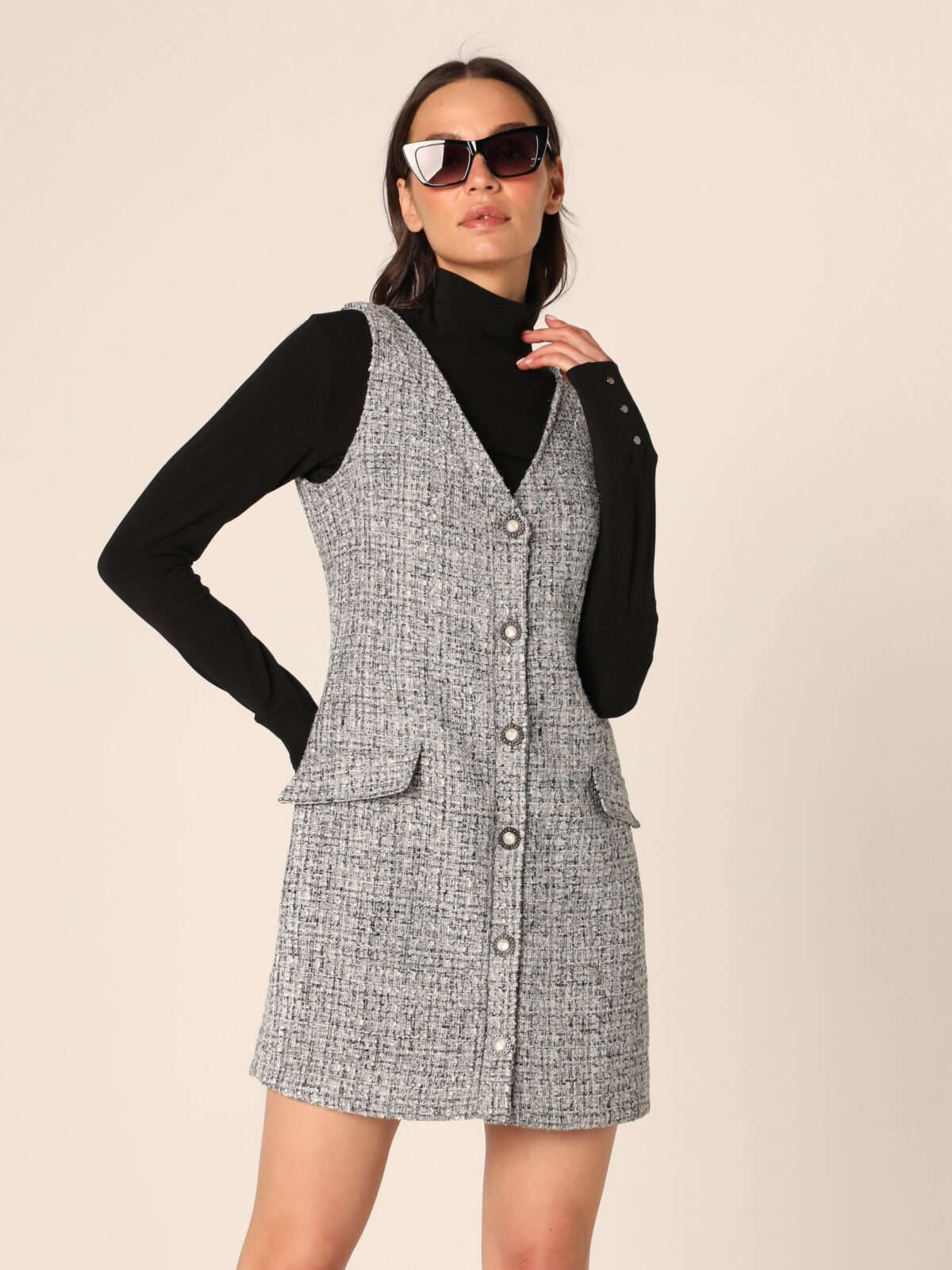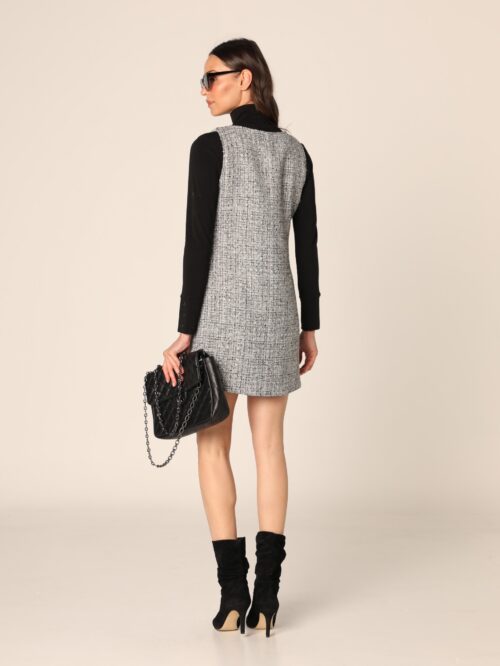 Haljina bez rukava od tkanine sa teksturom, dužine iznad kolena, sa kopčanjem na dugmad duž prednje strane. Ukrašena je sa dva prednja džepa sa klapnama i dekorativnim dugmadima.
