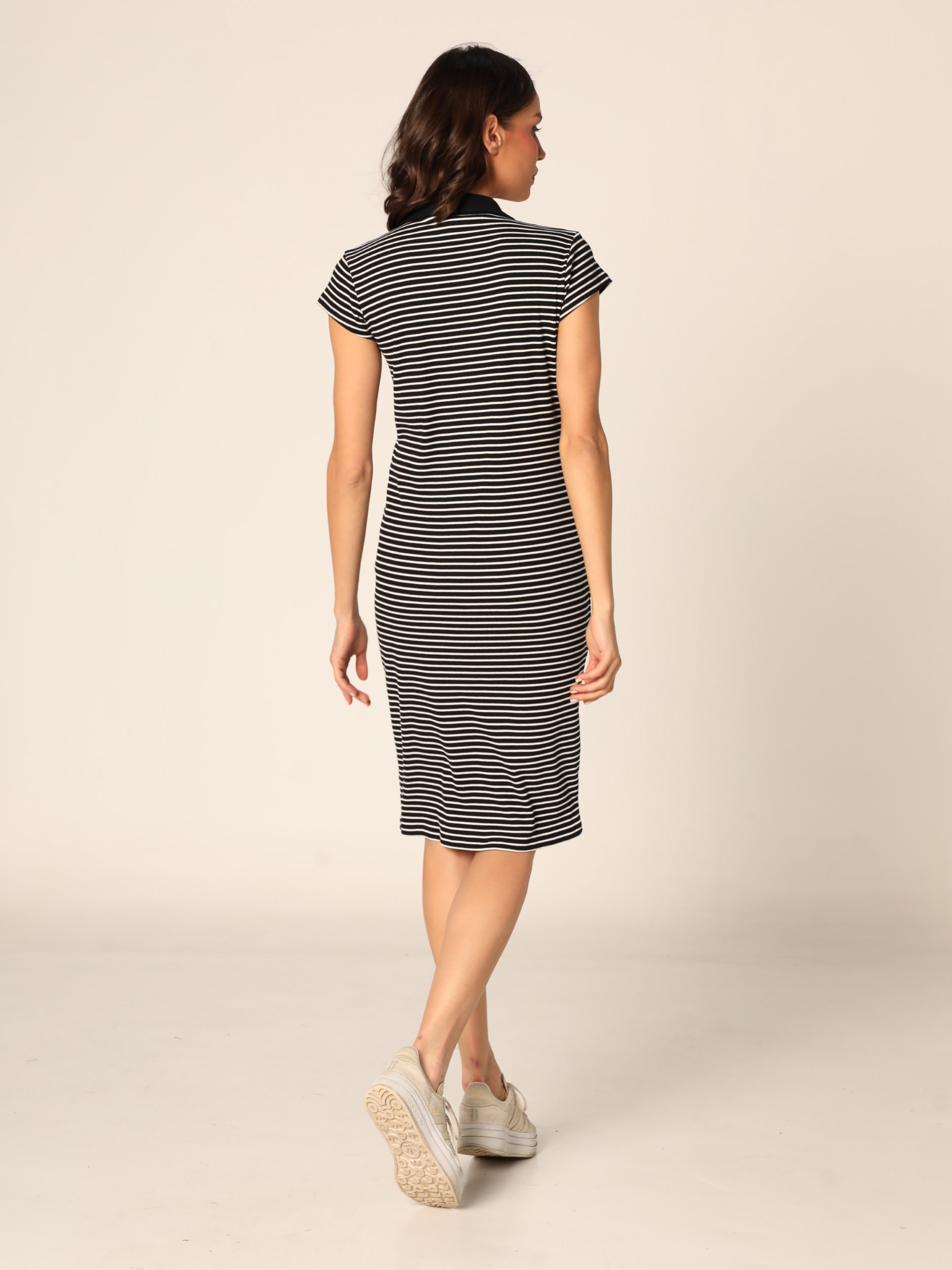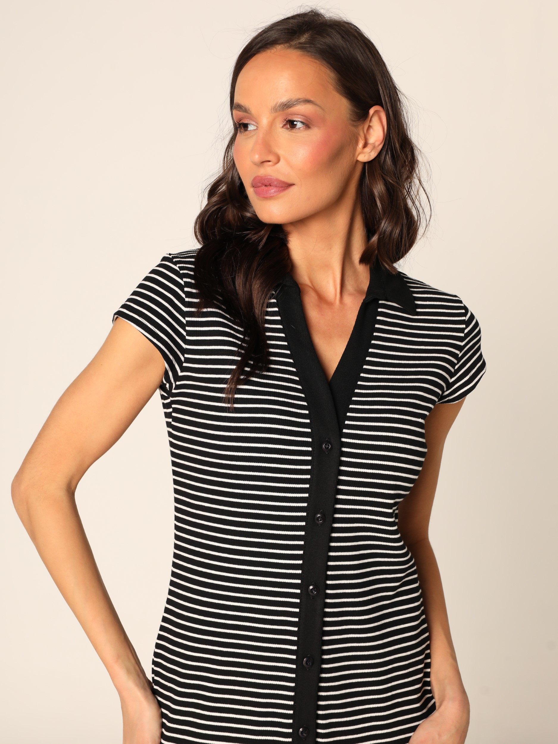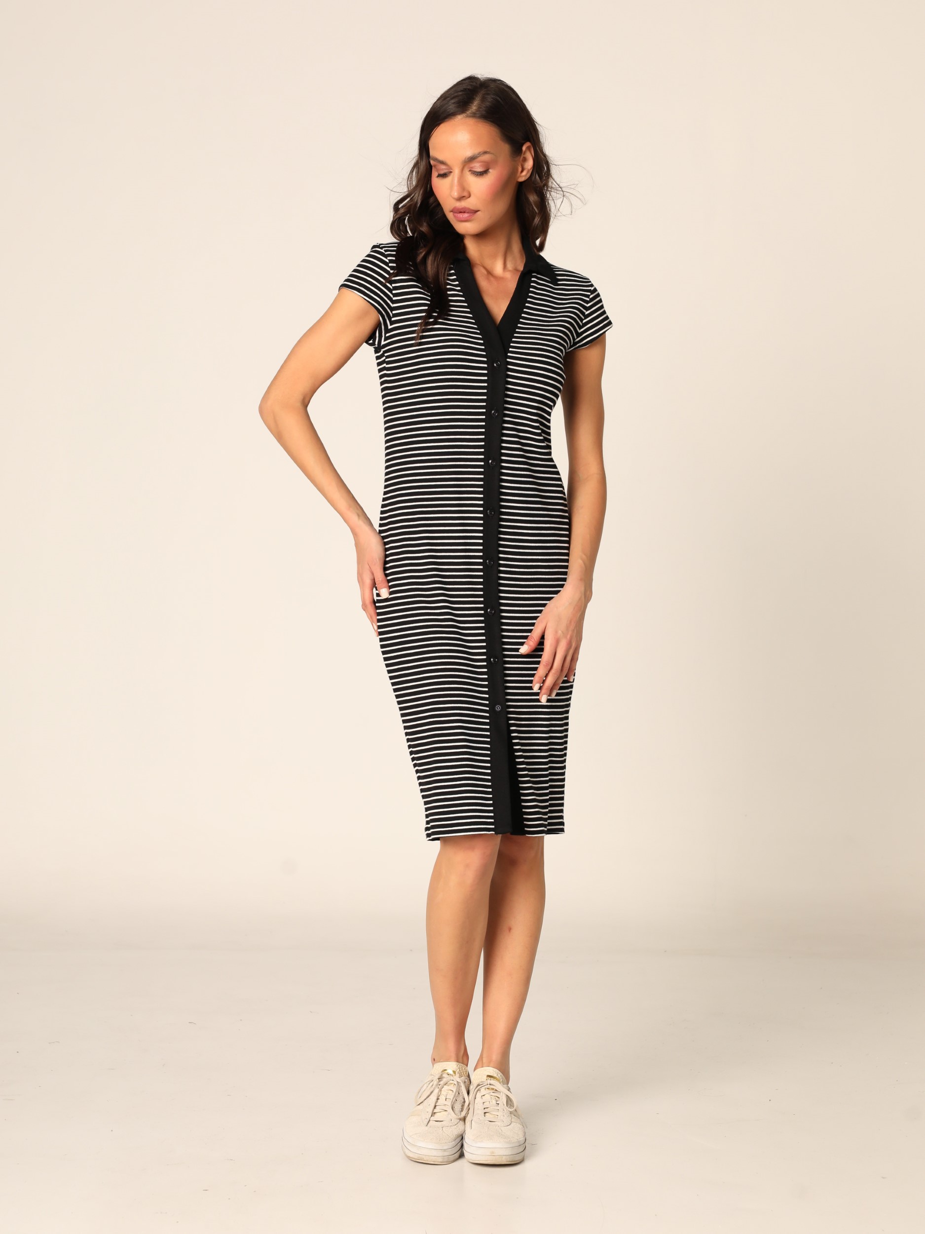 Uska rebrasta haljina do kolena u prugastom dezenu, sa kragnom i V izrezom, kopčanjem na dugmad duž prednje strane i kratkim rukavima, sa prorezom napred pri dnu.