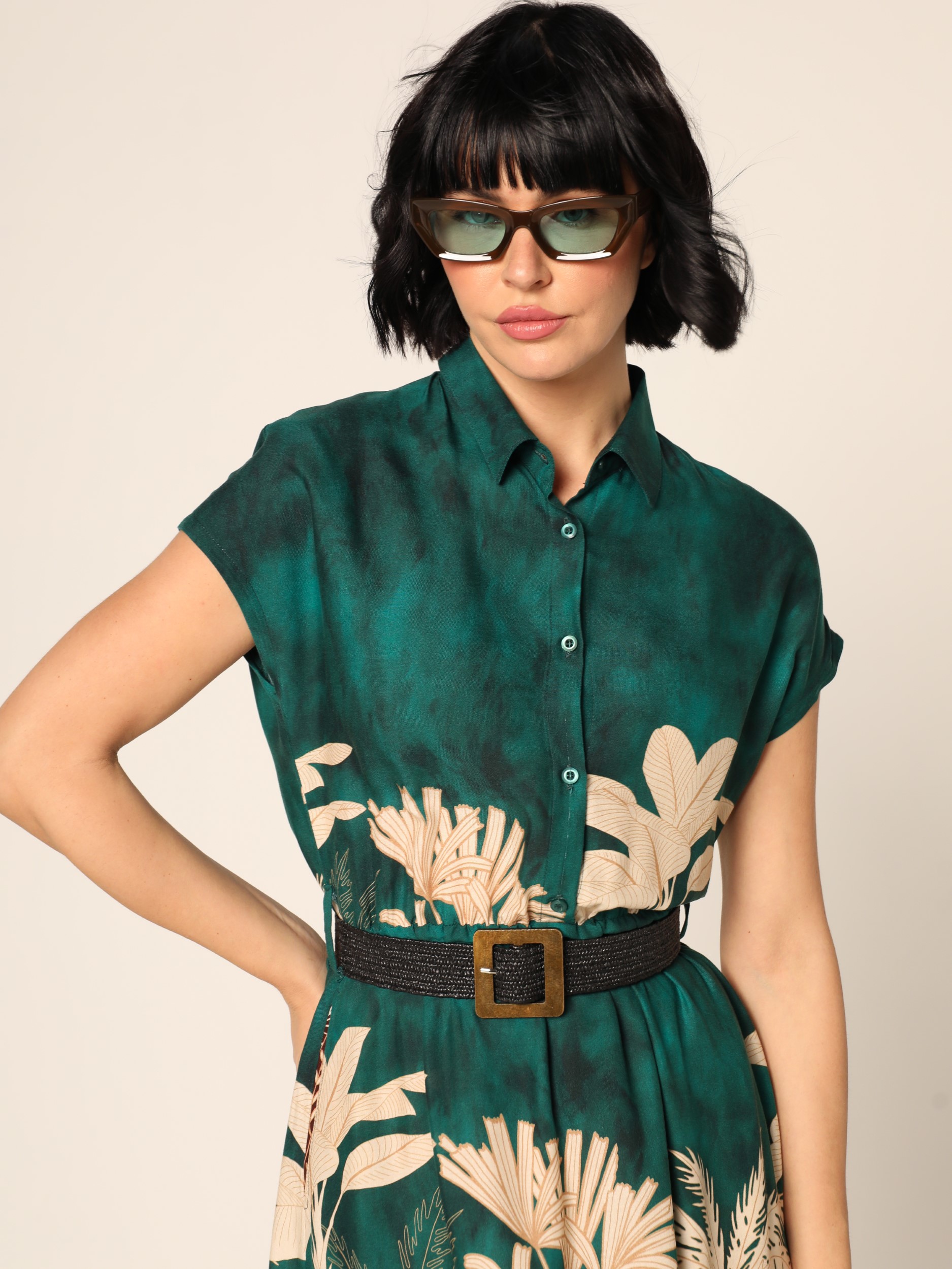 Maksi haljina u šarenom printu, A kroja sa kragnom i kopčanjem na dugmad duž prednje strane u gornjem delu. Sa kratkim rukavima i pletenim pojasom sa šnalom u struku. Dva bočna džepa.