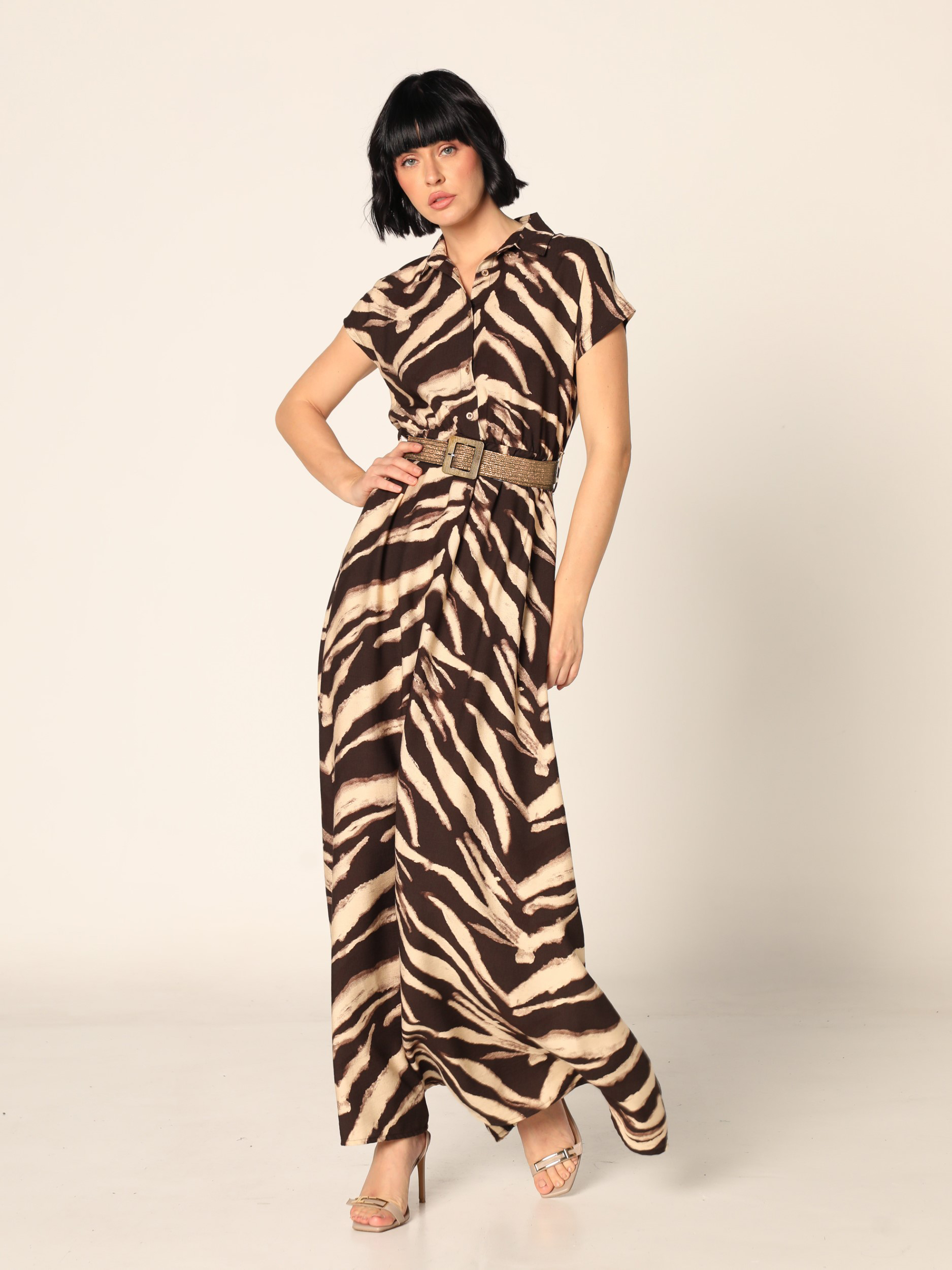 Maksi haljina u animal printu, A kroja sa kragnom i kopčanjem na dugmad duž prednje strane u gornjem delu. Sa kratkim rukavima i pletenim pojasom sa šnalom u struku. Dva bočna džepa.
