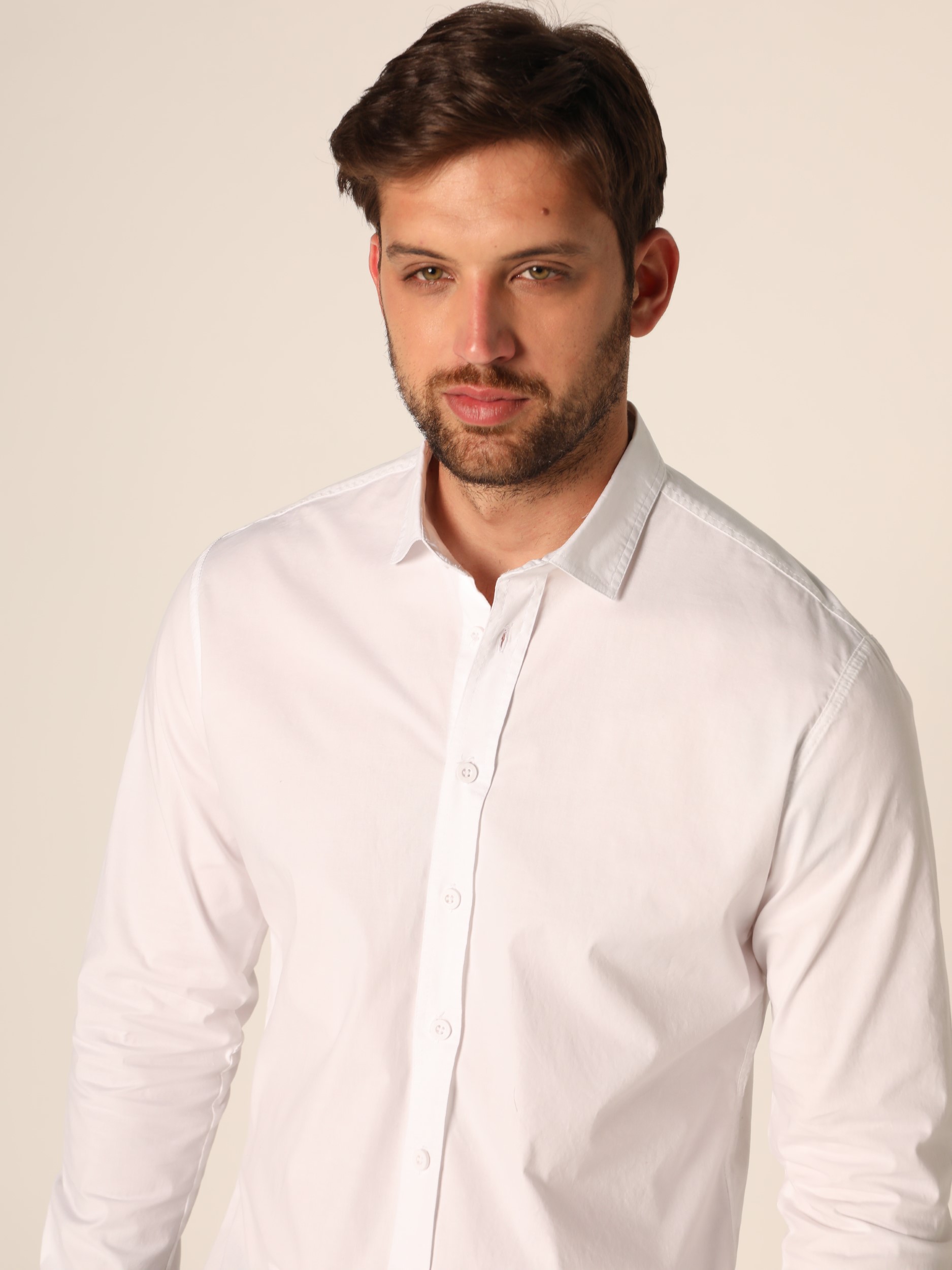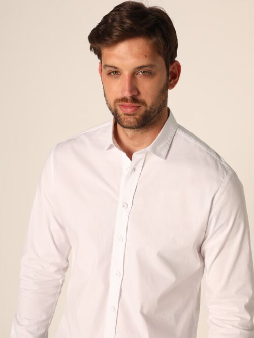Klasična jednobojna košulja dugih rukava sa kragnom i kopčanjem na dugmiće celom dužinom.