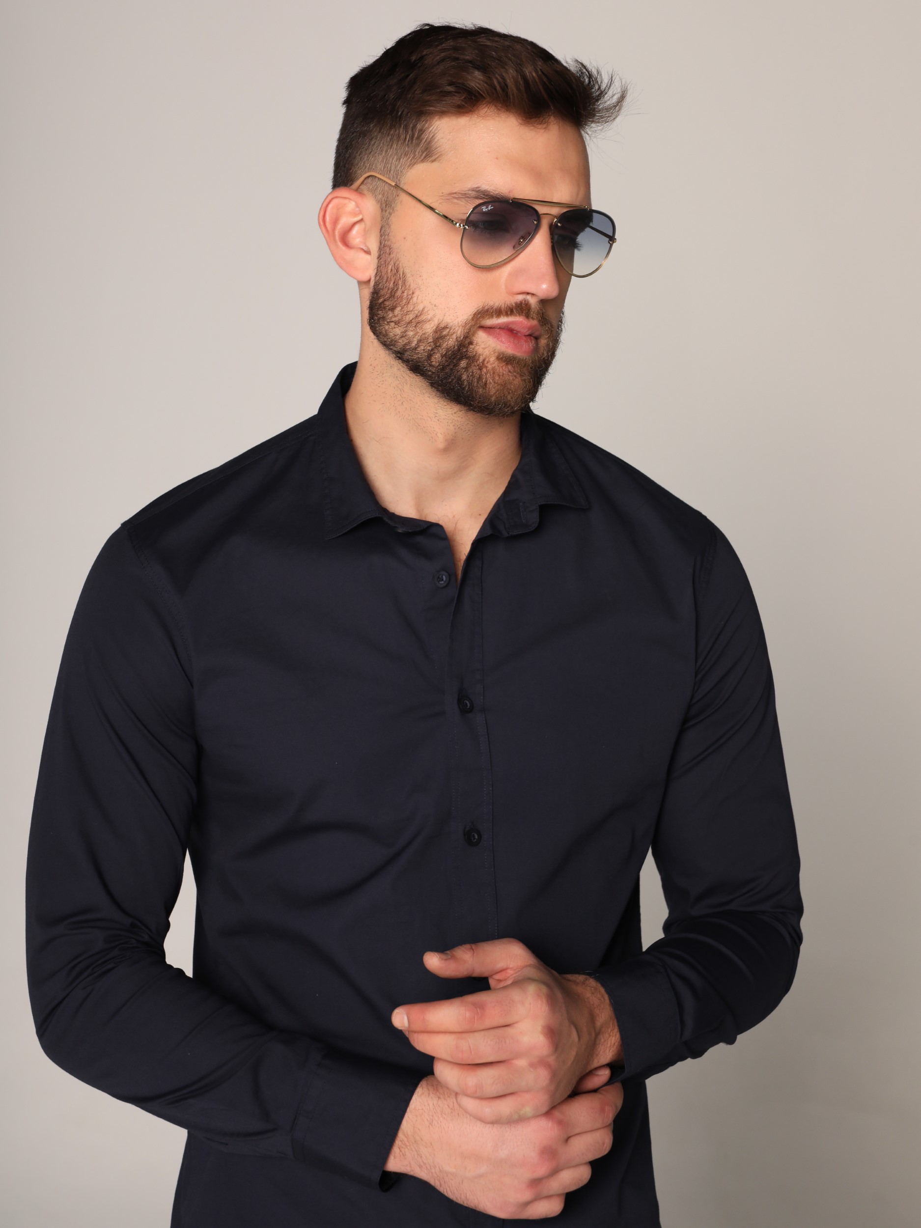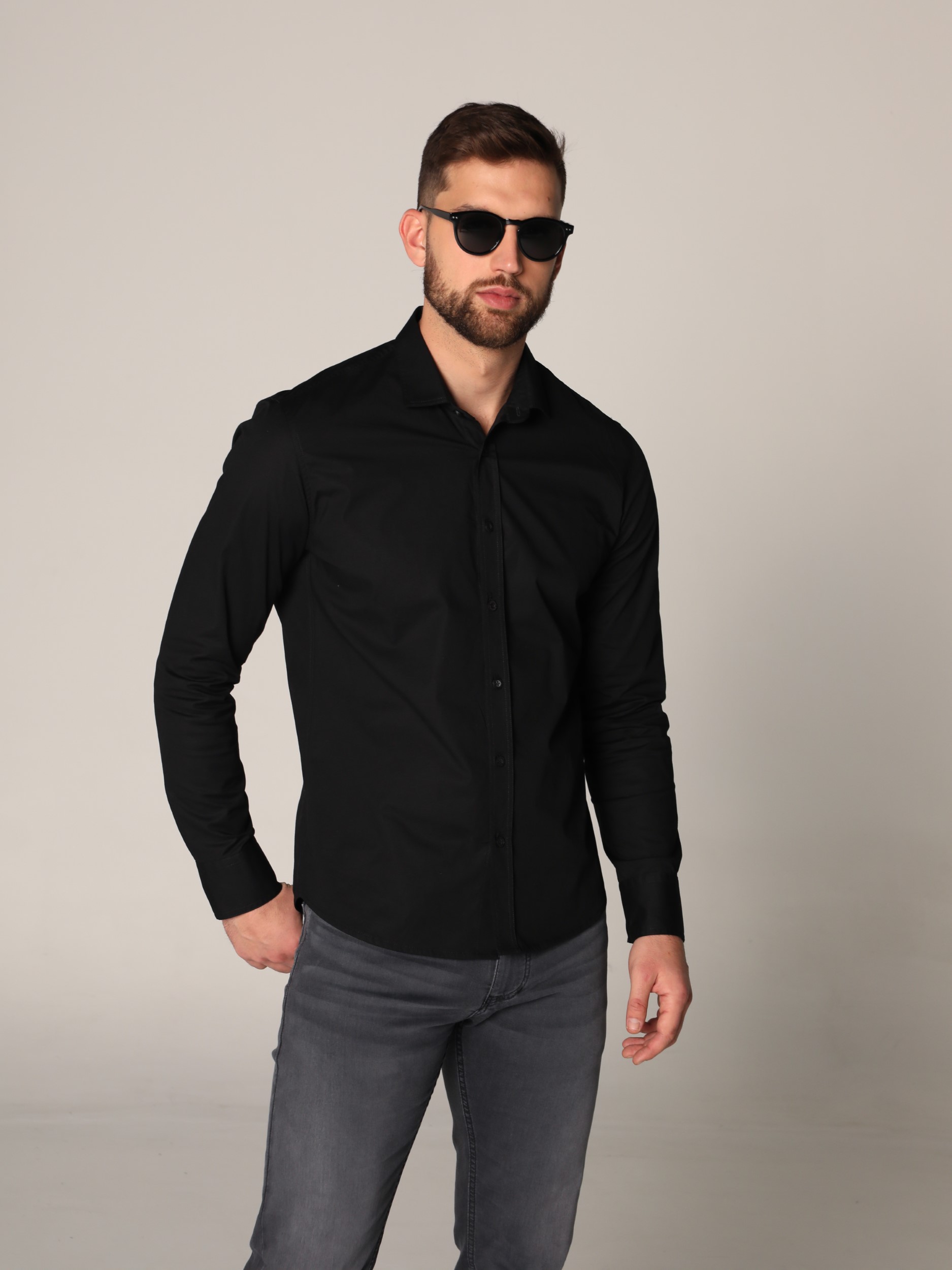 Klasična jednobojna košulja dugih rukava sa kragnom i kopčanjem na dugmiće celom dužinom.