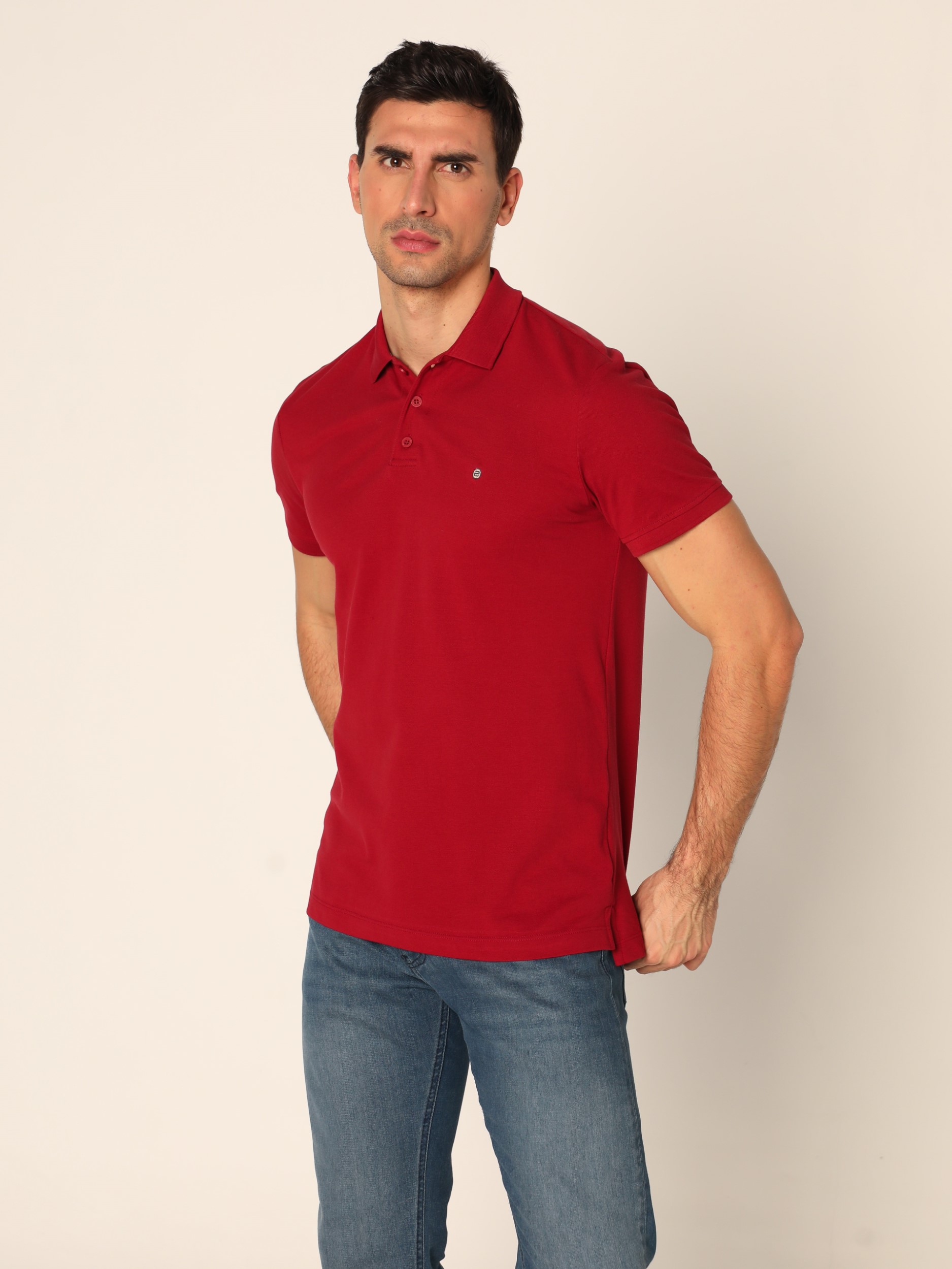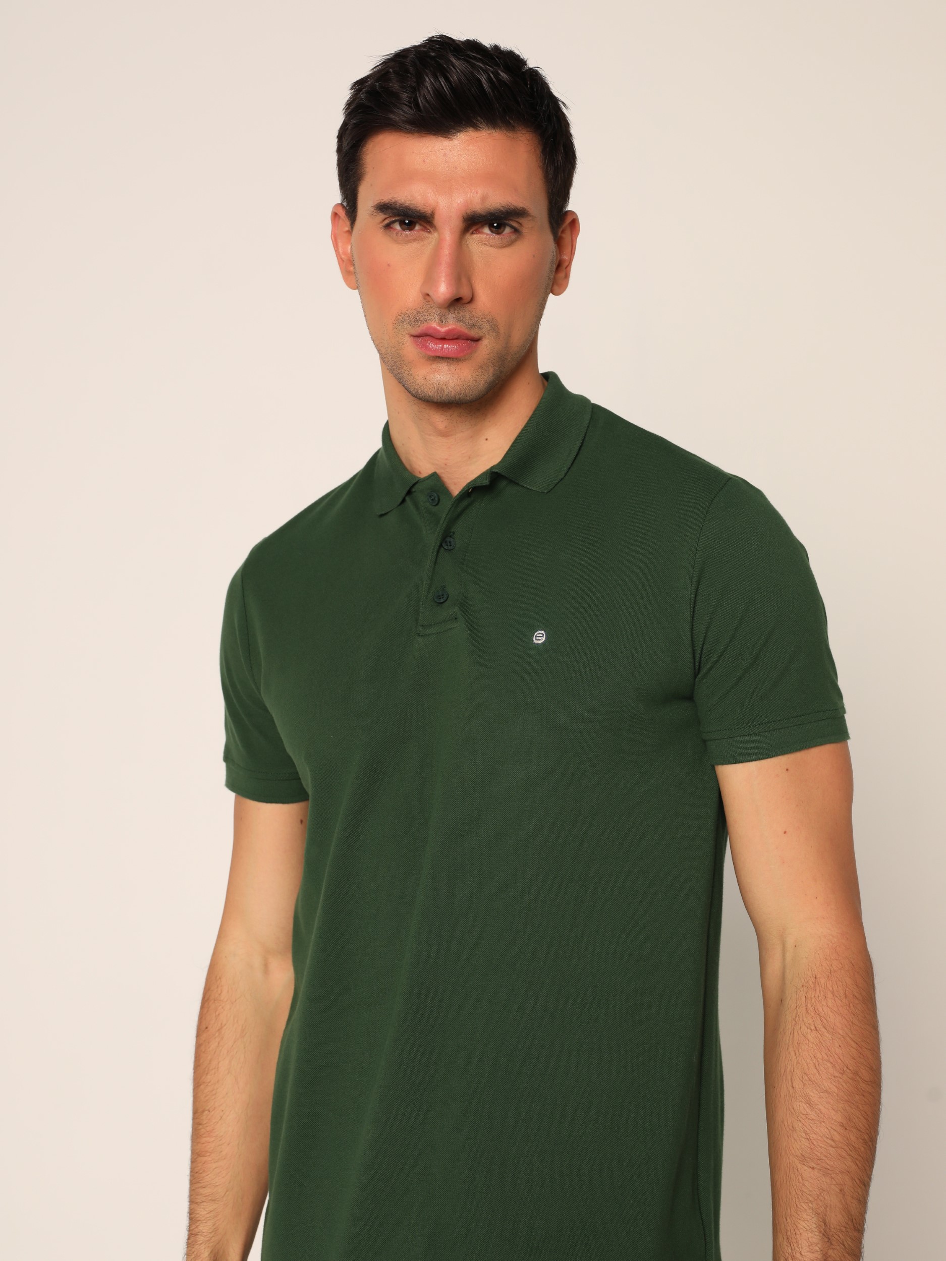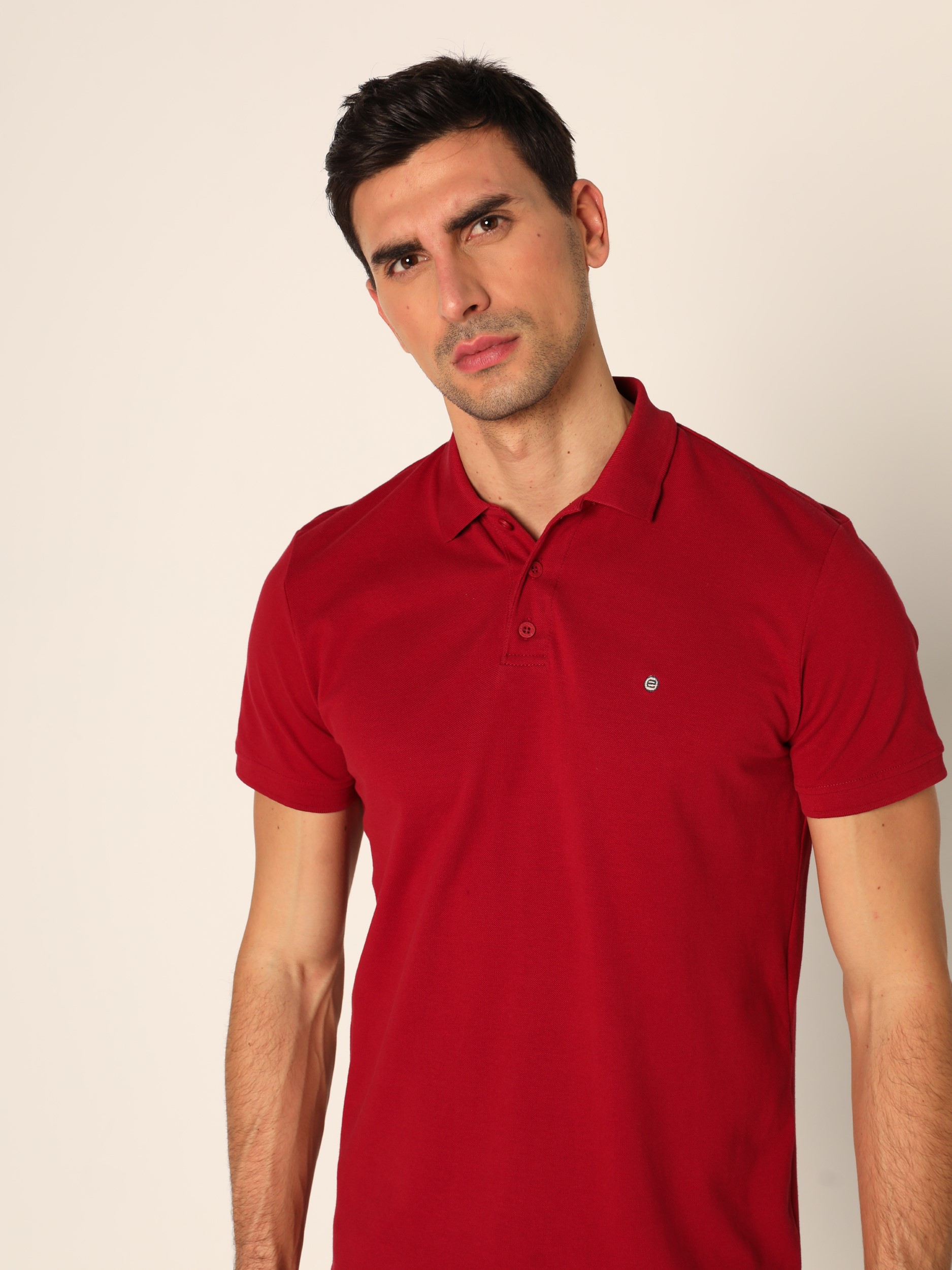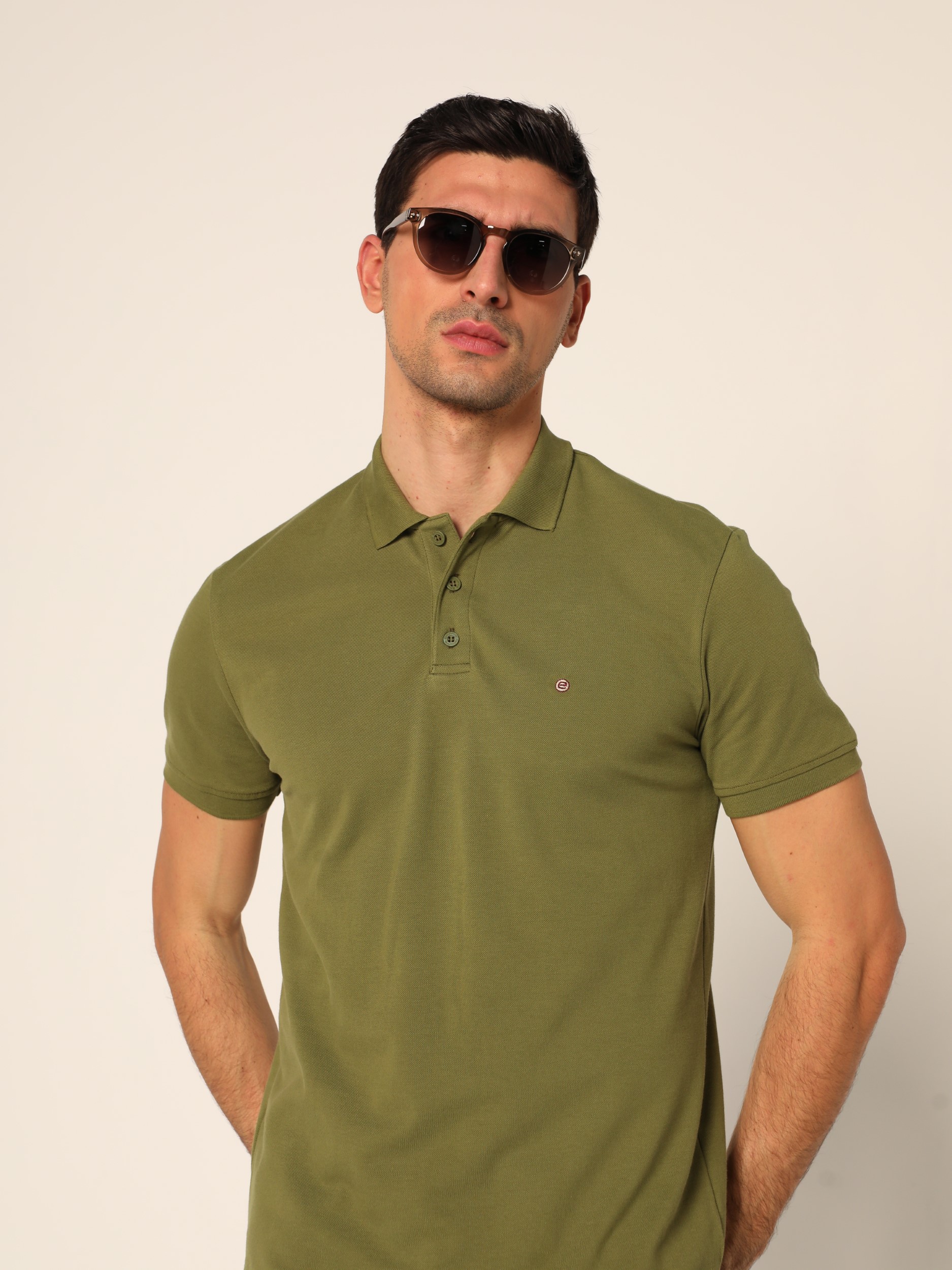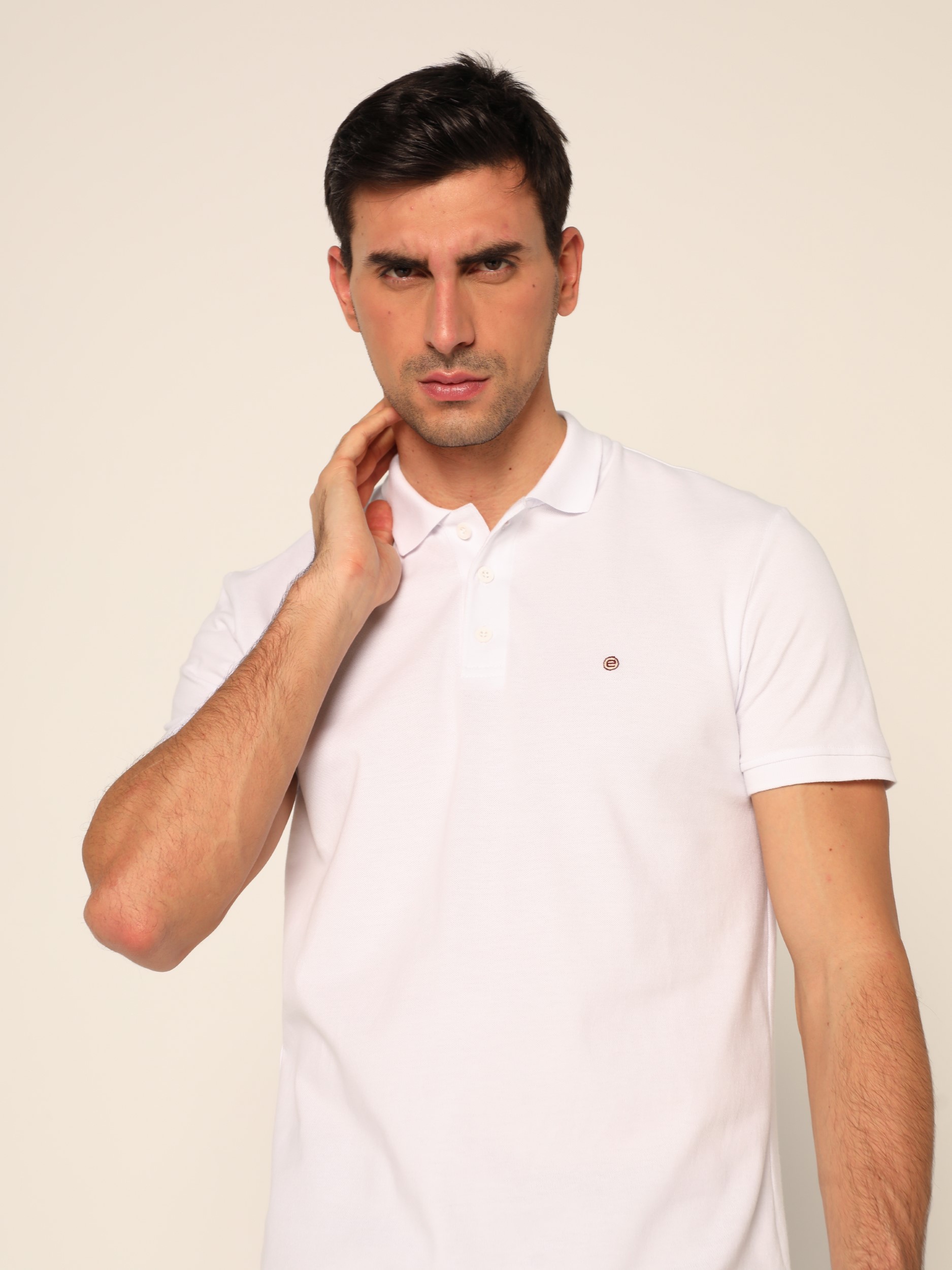 Klasična polo majica sa kragnom i kopčanjem na tri dugmeta na kratke rukave. Diskretan vez na grudima.