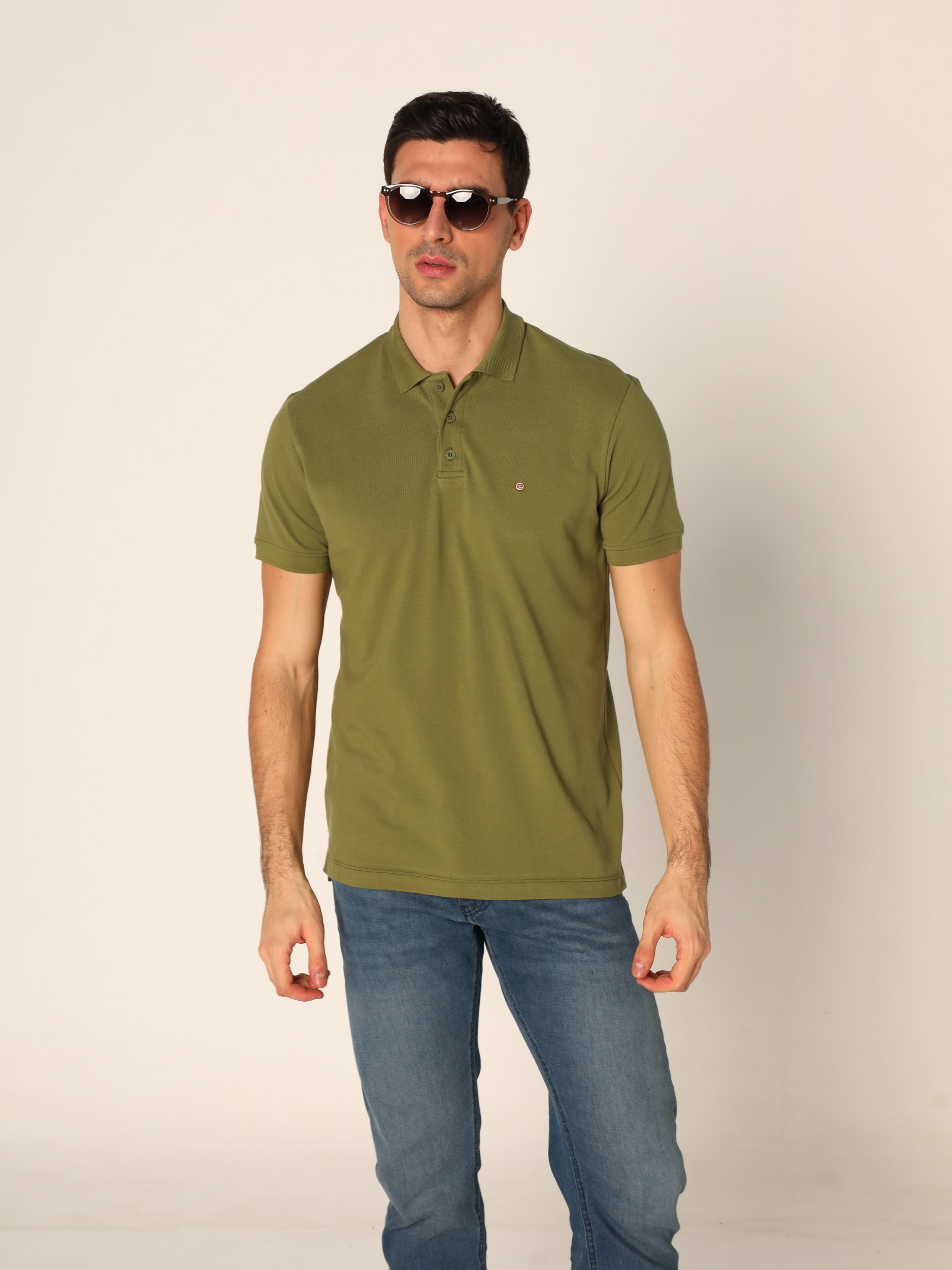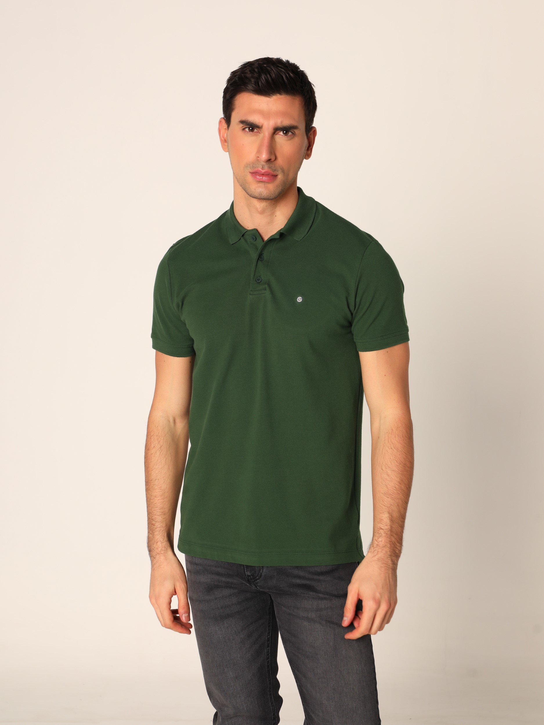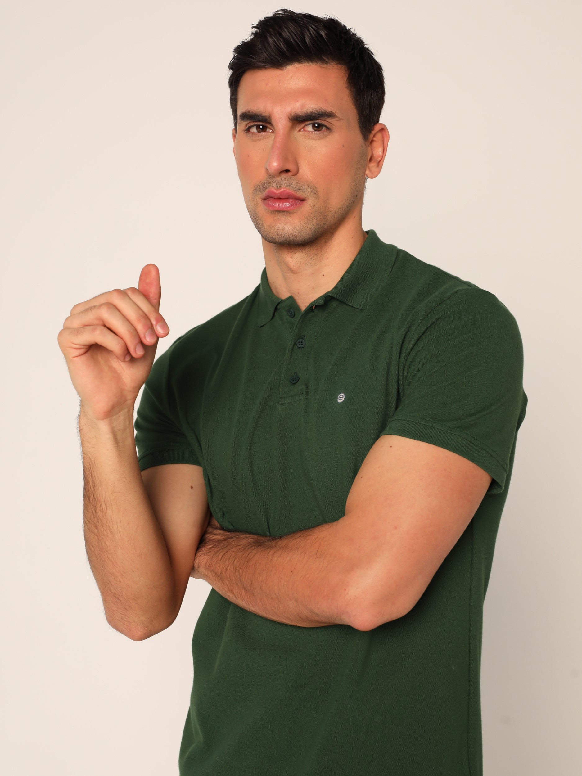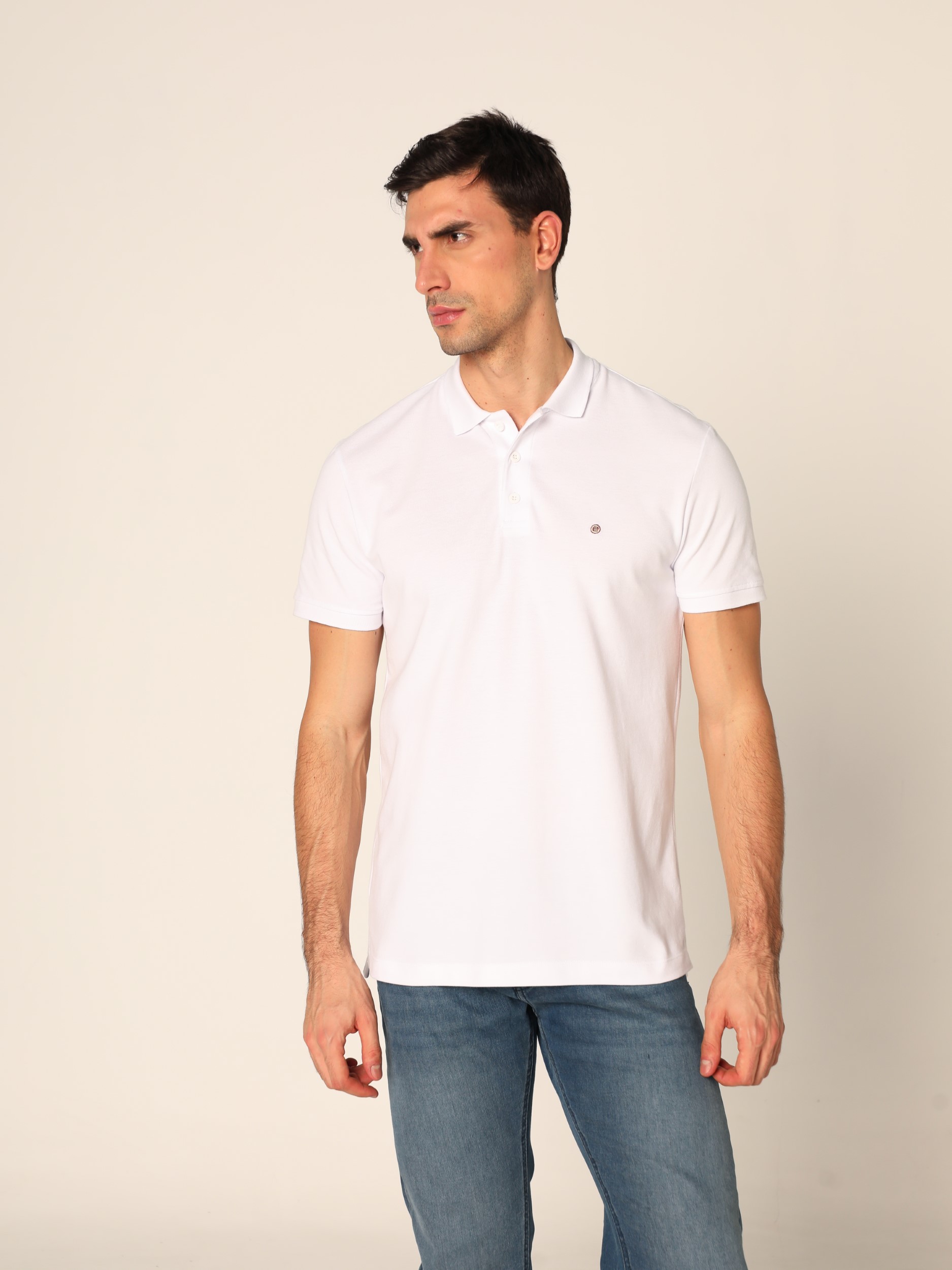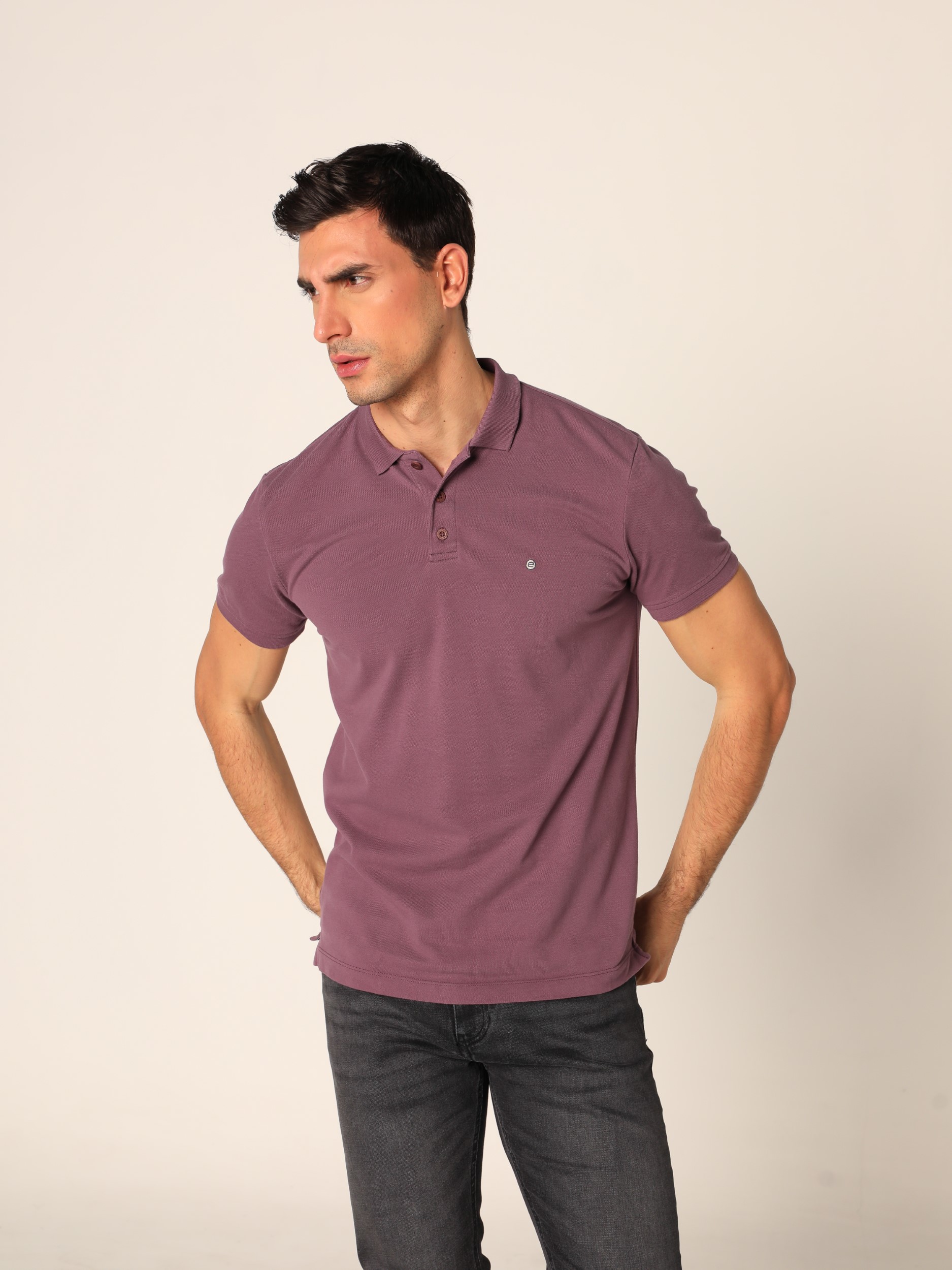 Klasična polo majica sa kragnom i kopčanjem na tri dugmeta na kratke rukave. Diskretan vez na grudima.