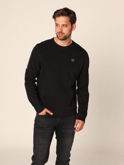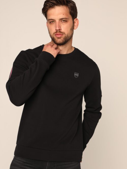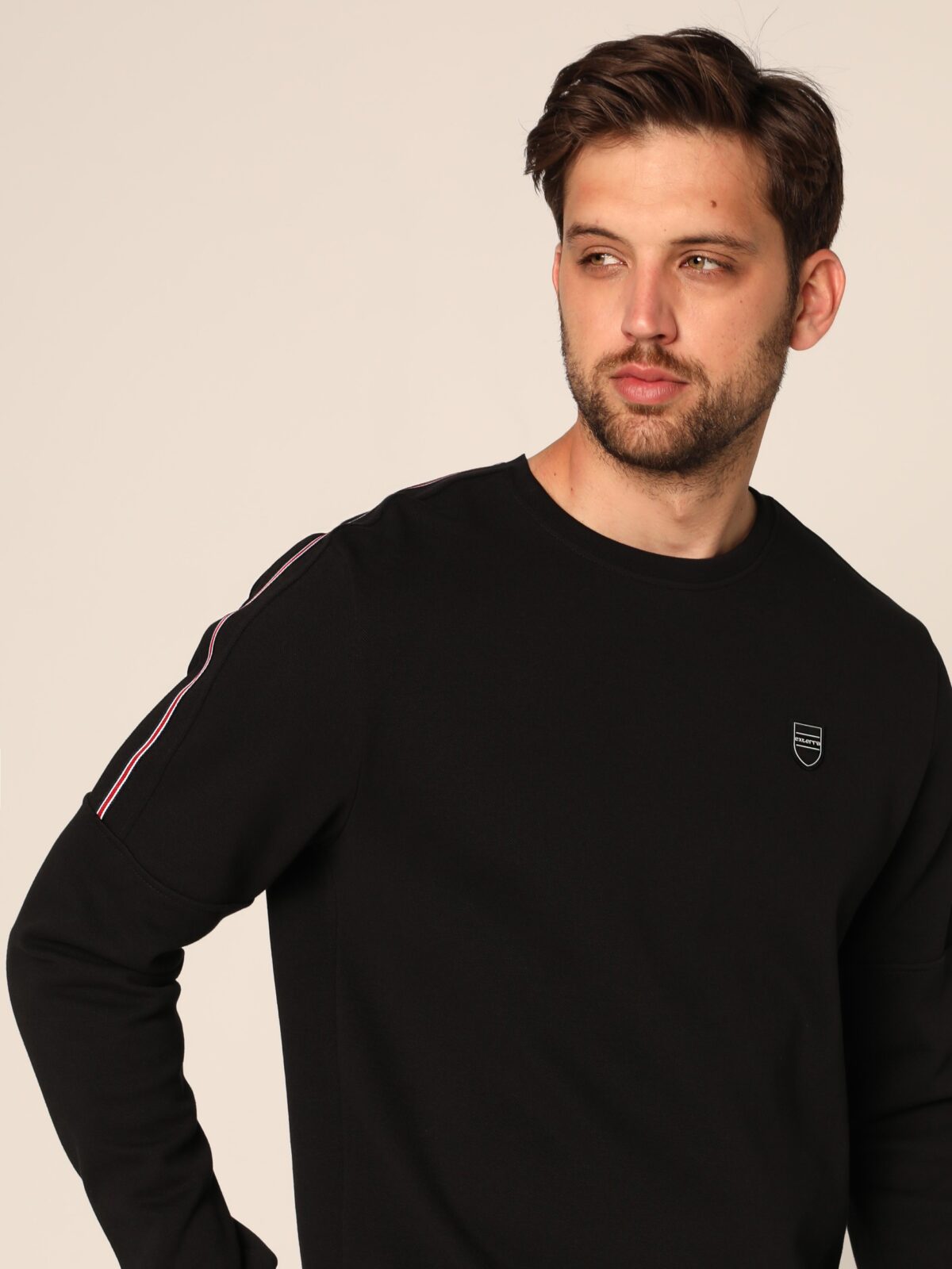 Duks dugih rukava sa okruglim izrezom, trakom u kontrastnim prugama duž ramena i male aplikacije na grudima. Donji rub i rukavi završeni su ranflom.