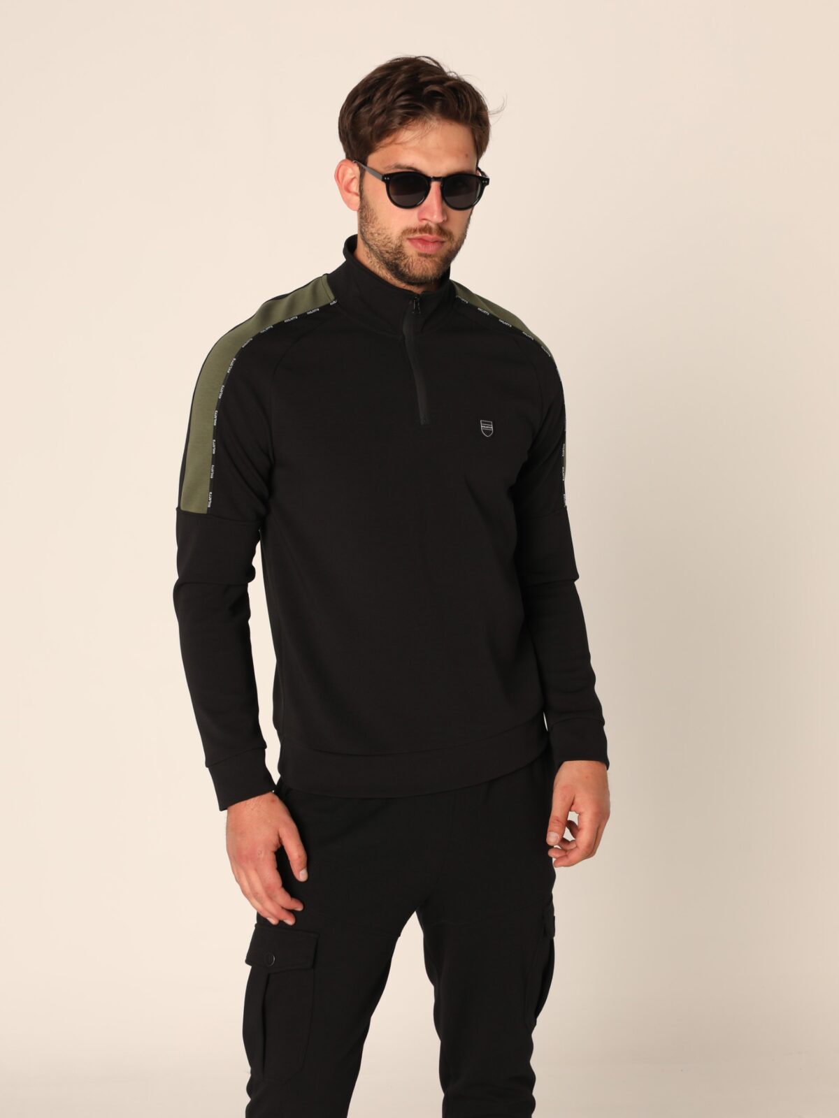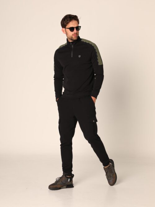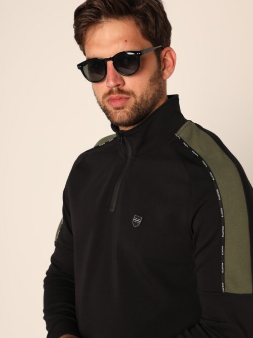 Duks sa rajsferšlusom do grudi i podignutom kragnom. Duž rukava traka sa printom, a na grudima mali gumirani amblem.
