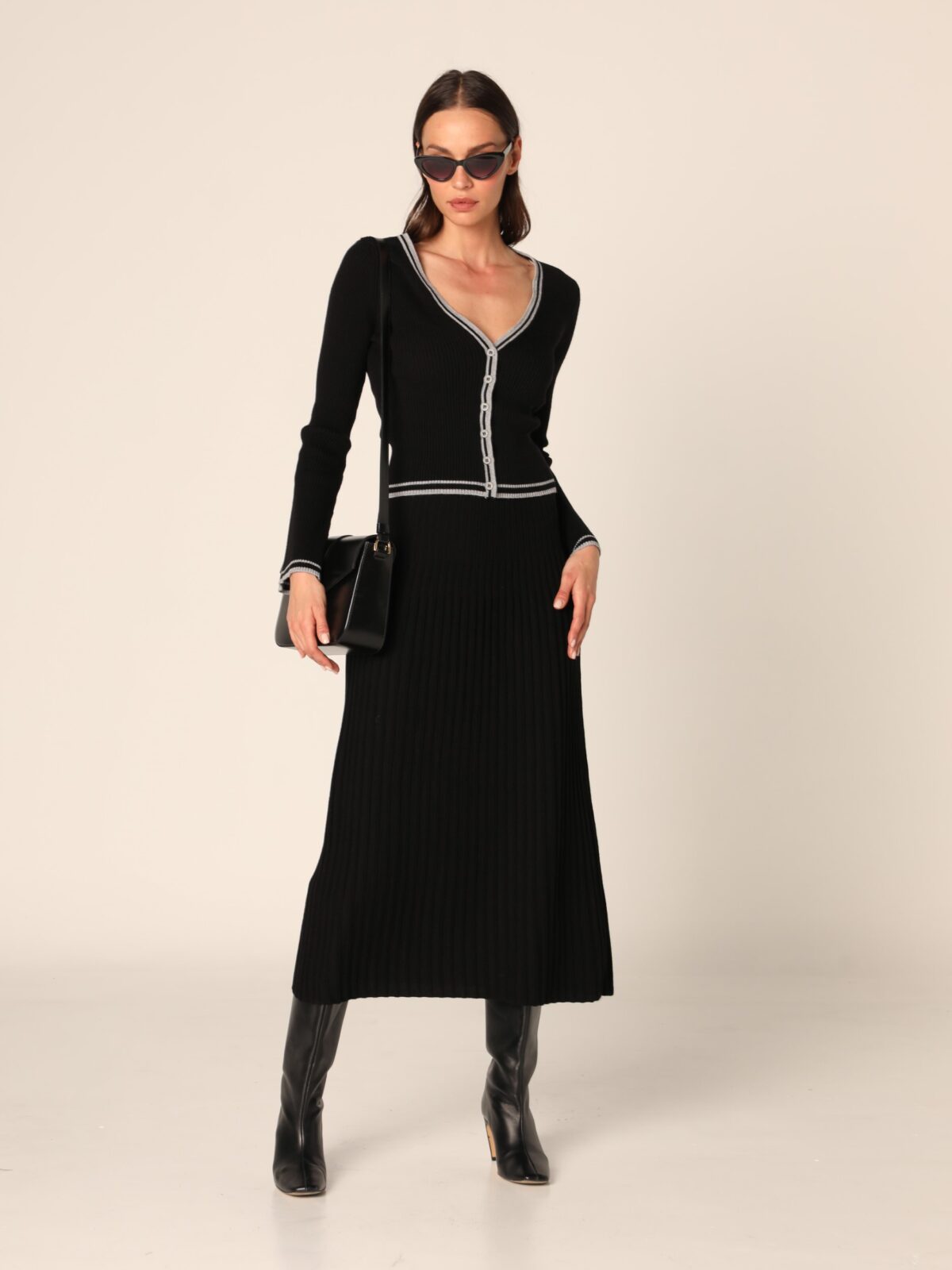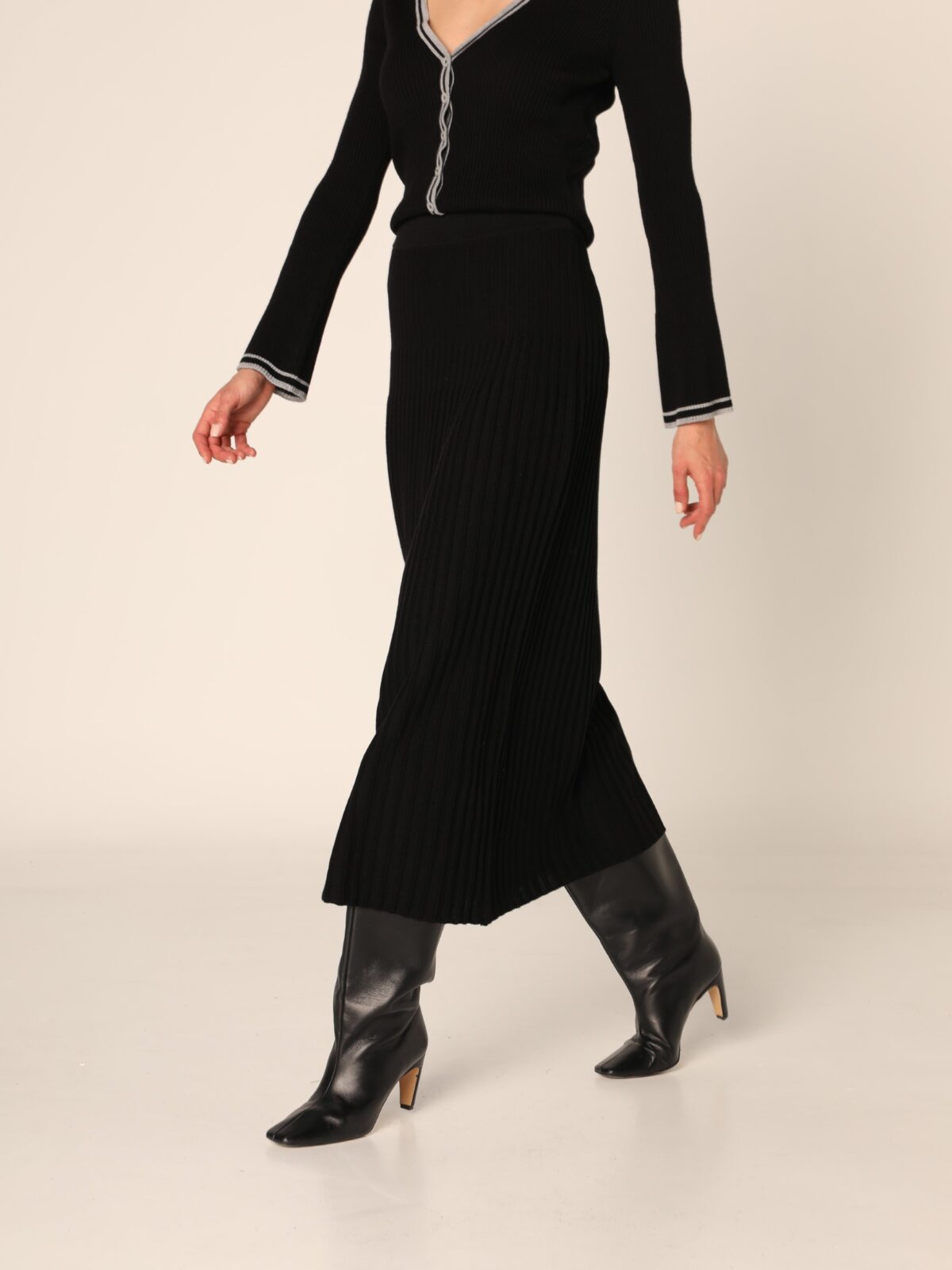 Rebrasta suknja A-kroja, dužine ispod kolena, sa elastičnim pojasom i blagim faltama.