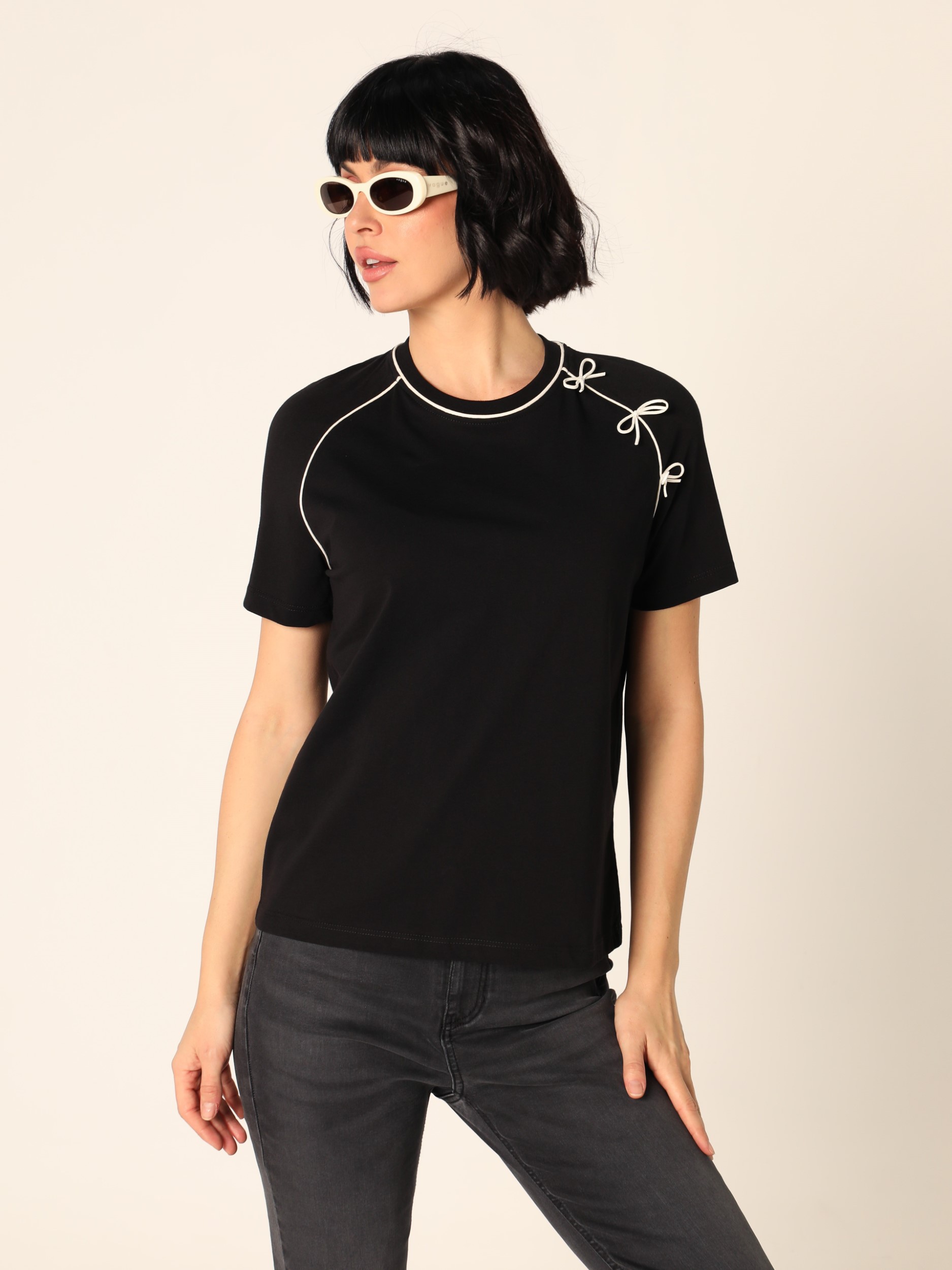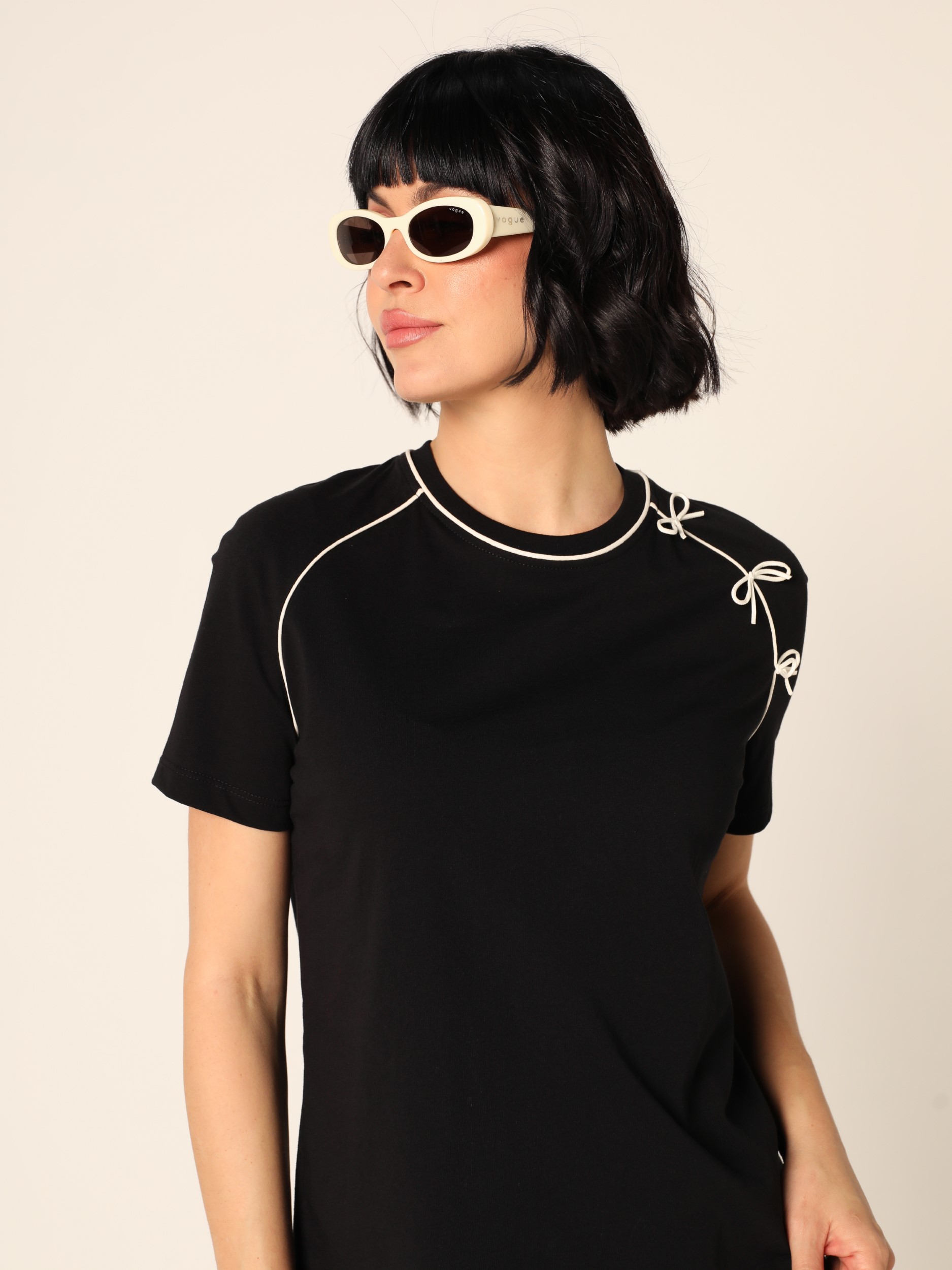 Majica kratkih rukava sa okruglim izrezom, sa kontrastnim paspulom duž izreza i šavova na ramenima, sa dekorativnim mašnama na jednom ramenu.
