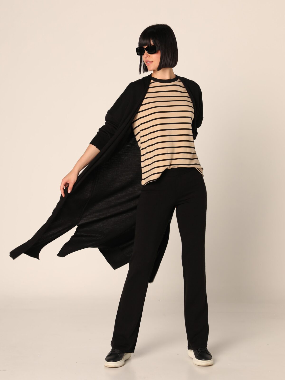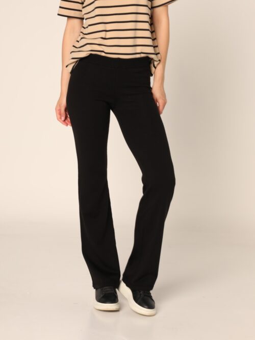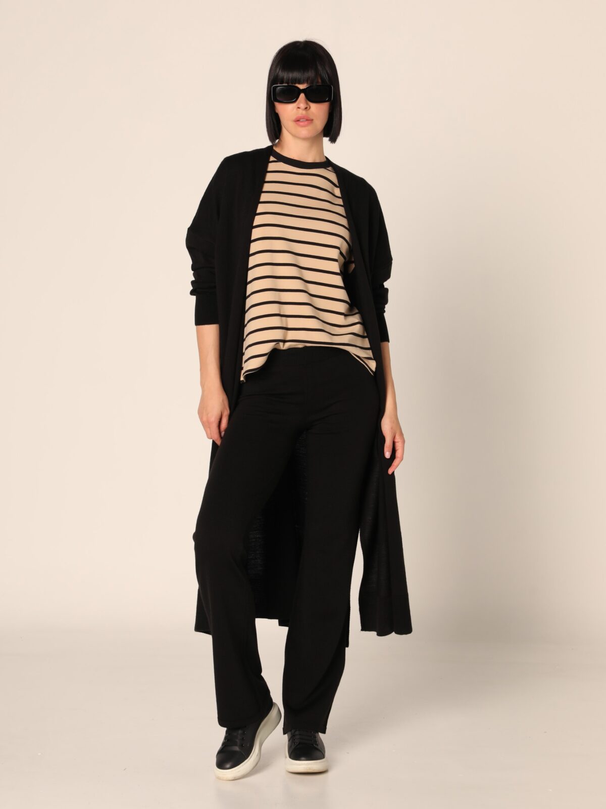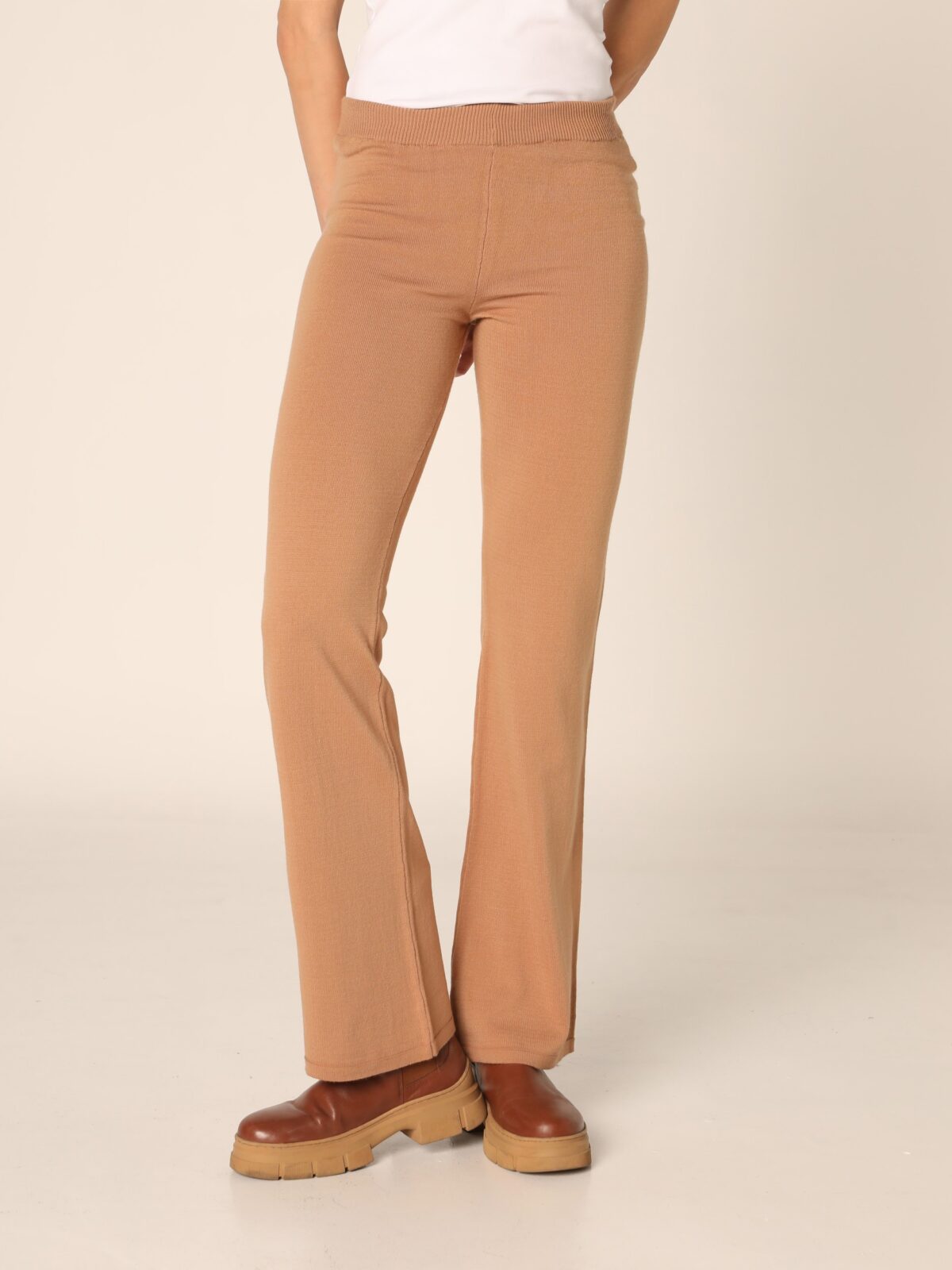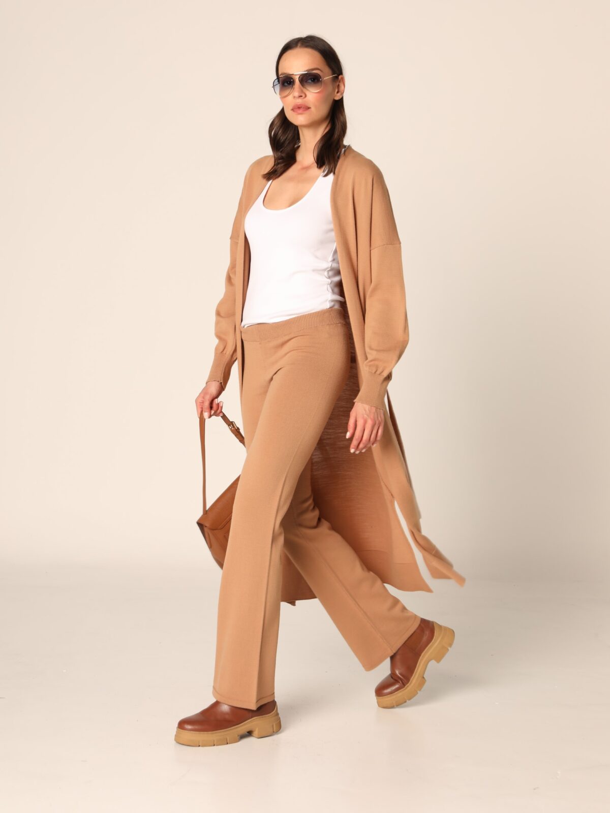 Pletene pantalone sa elastičnim pojasom, ravnih nogavica i laganog pada. Idealne za kombinovanje sa odgovarajućim kardiganom iz seta.
