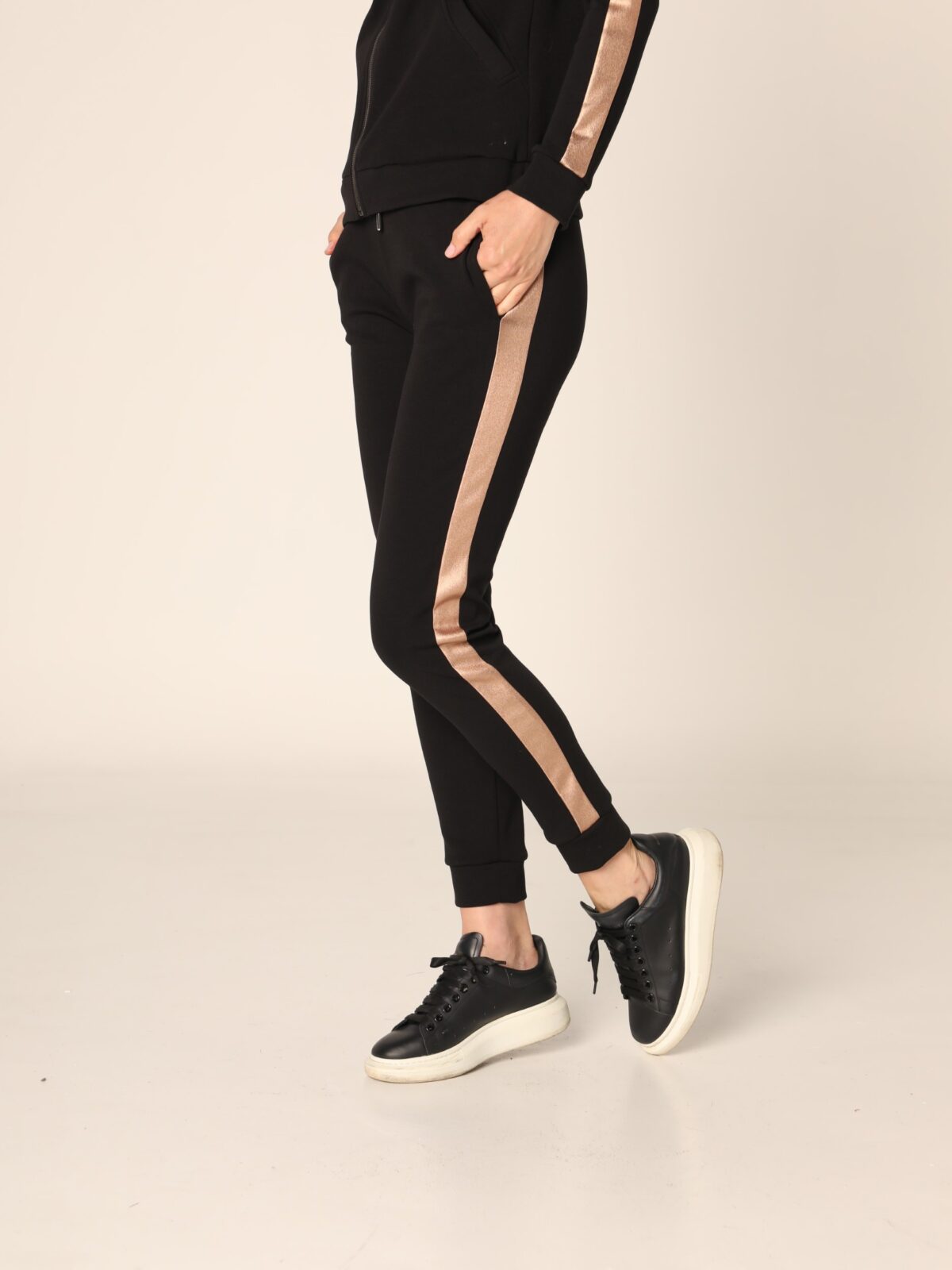 Donji deo trenerke sa dubokim strukom i elastičnim pojasom. Model ima bočne džepove i srebrnu traku duž nogavica. Nogavice se završavaju ranflama.