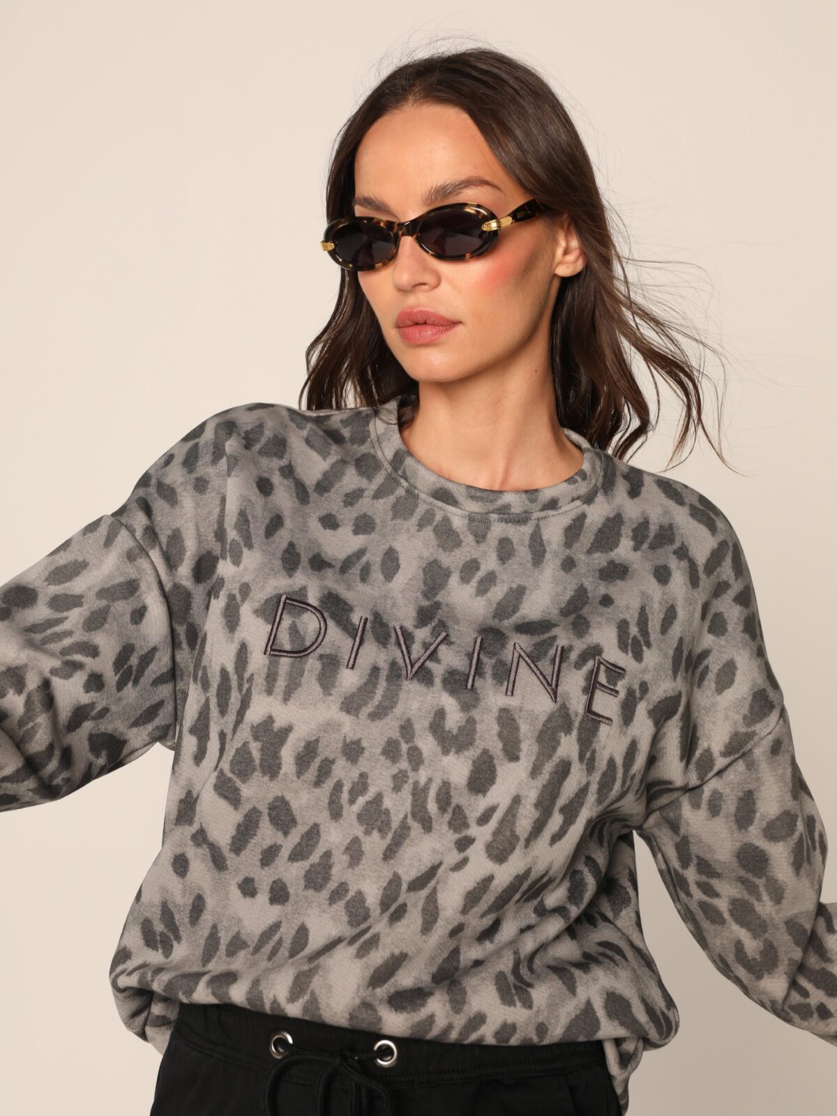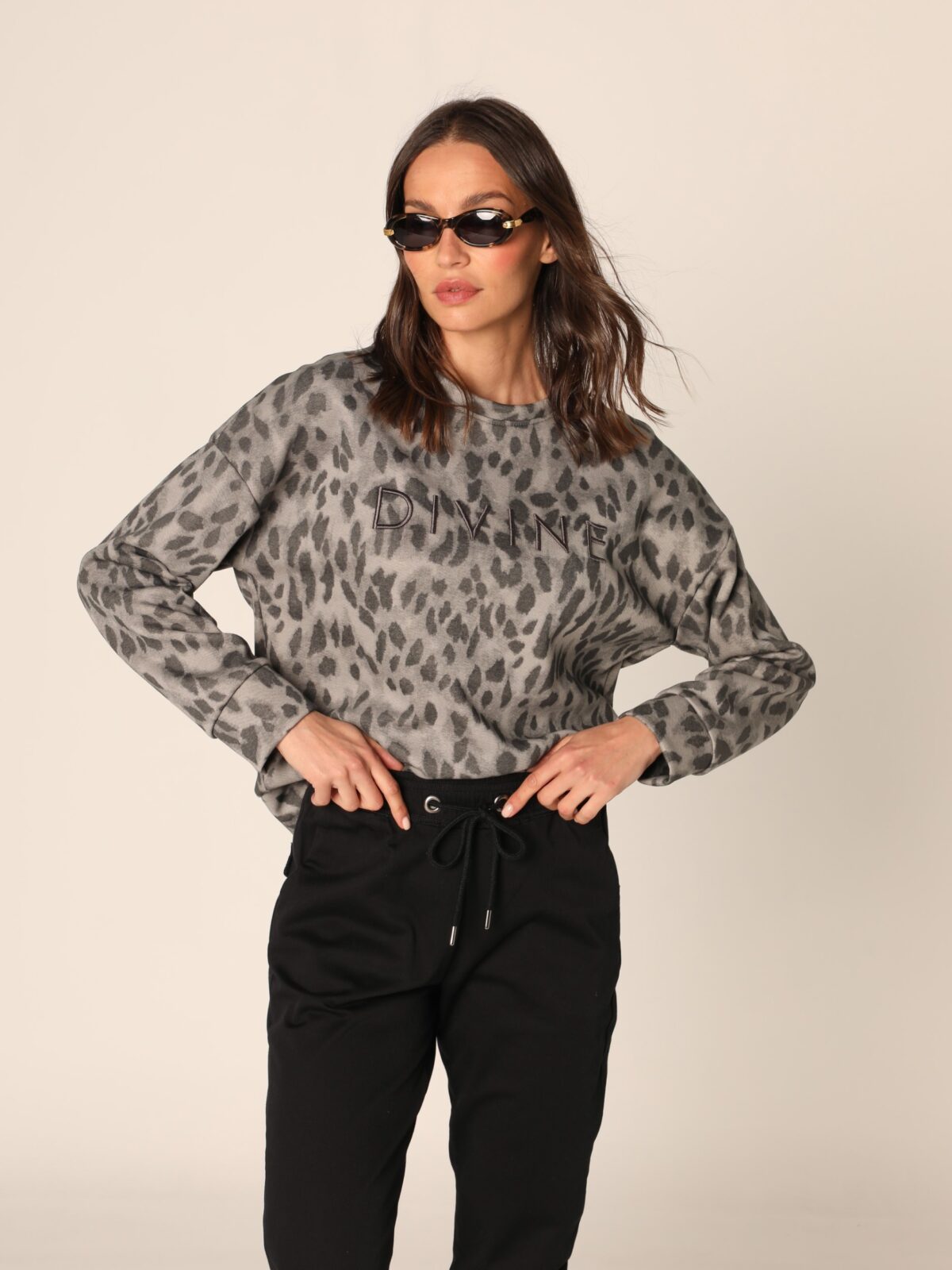 Duks u animal printu sa vezom na prednjem delu. Ima okrugli izrez i duge rukave sa ranflom. Donji rub je završen elastičnom paspulom.