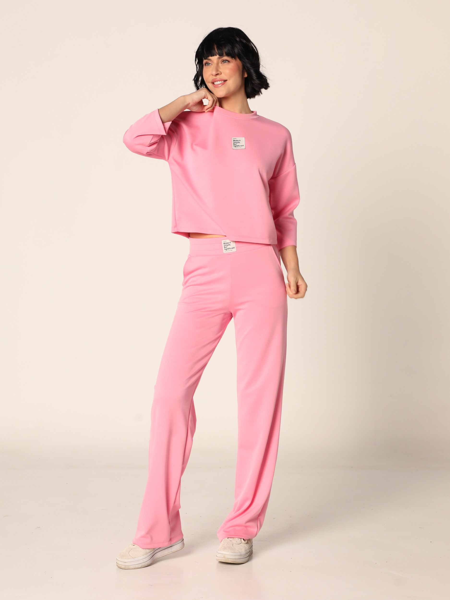 Duks ravnog kroja sa oborenim ramenima, tričetvrt rukavima i malom aplikacijom na prednjem delu.