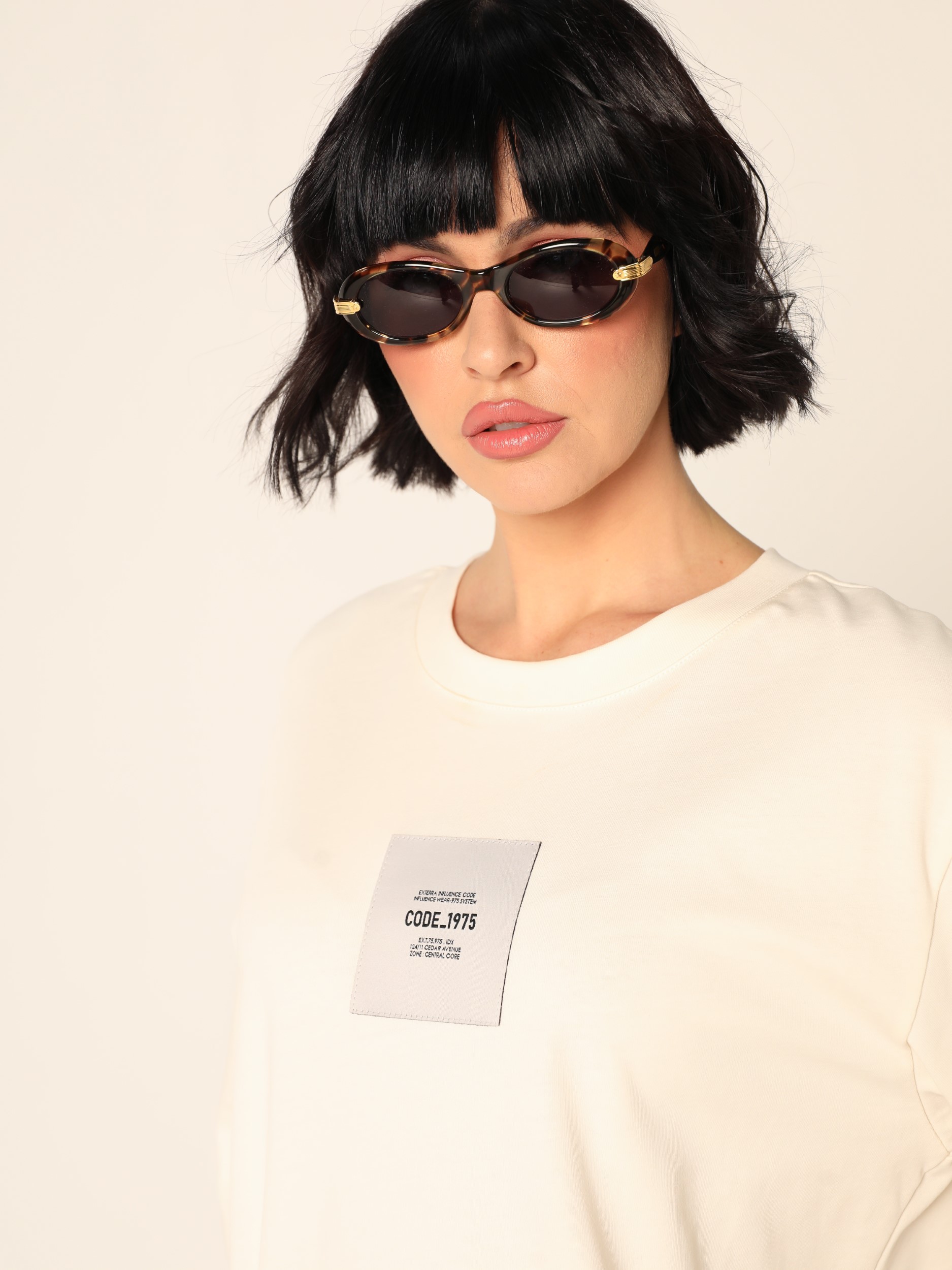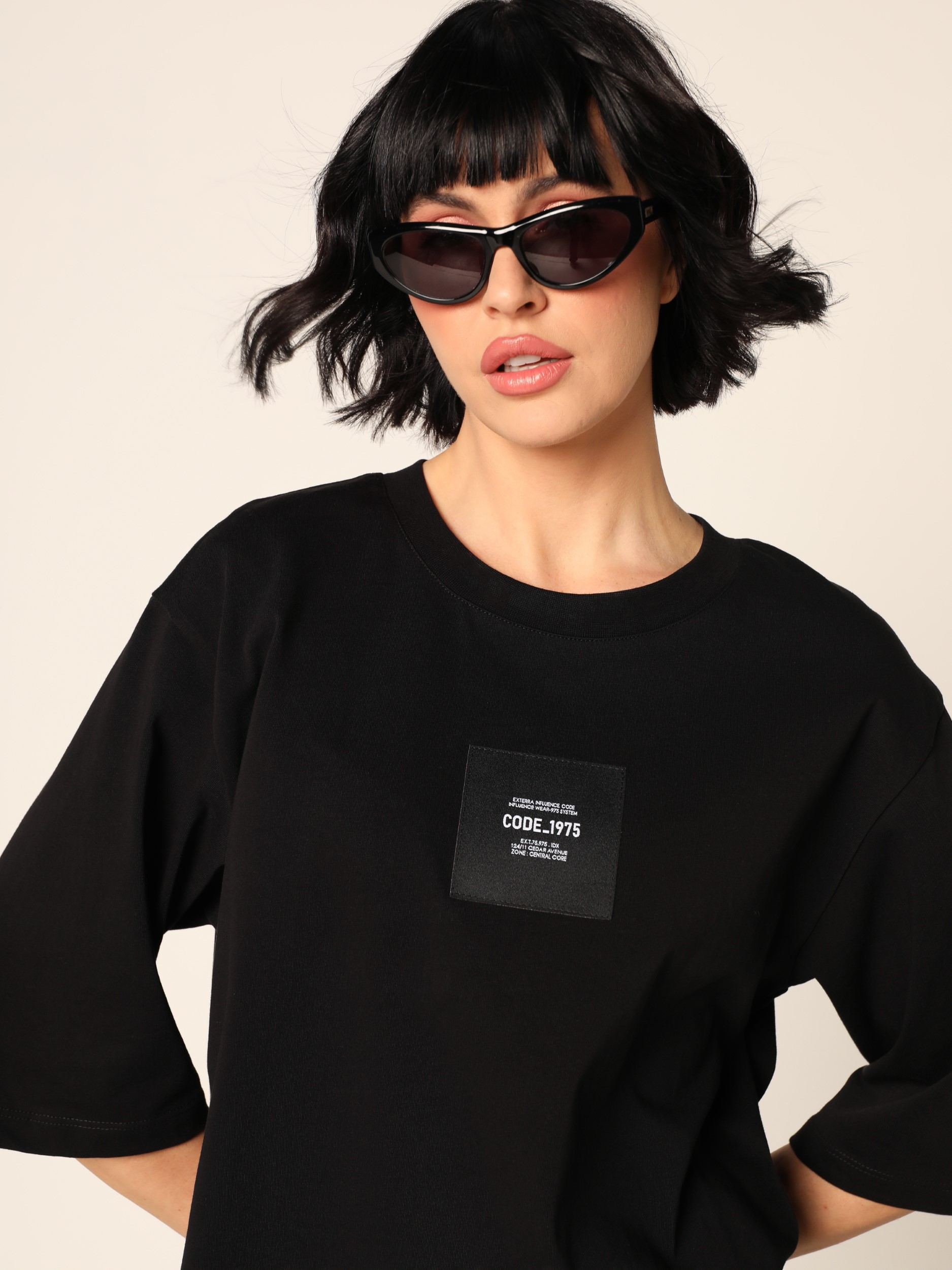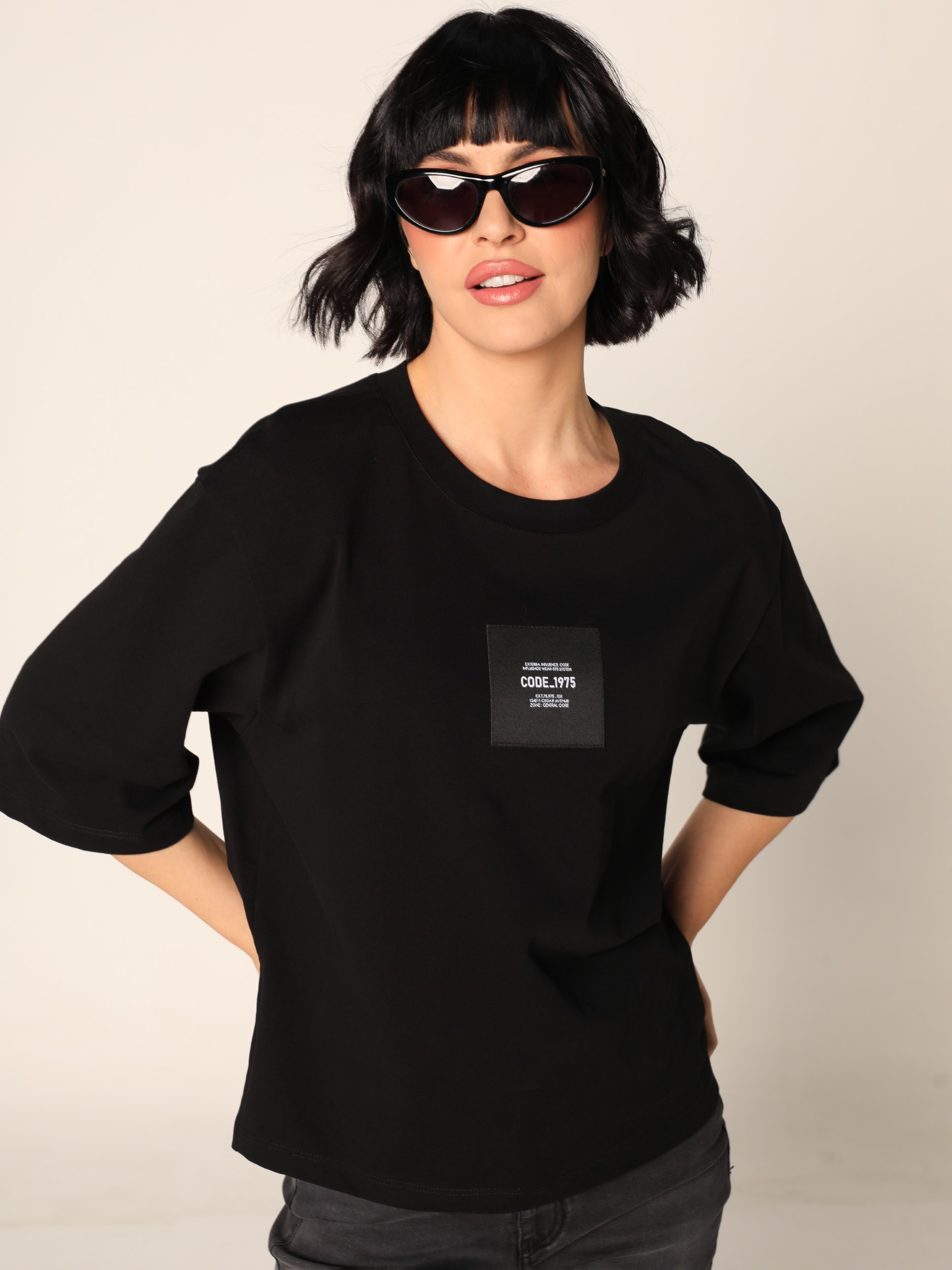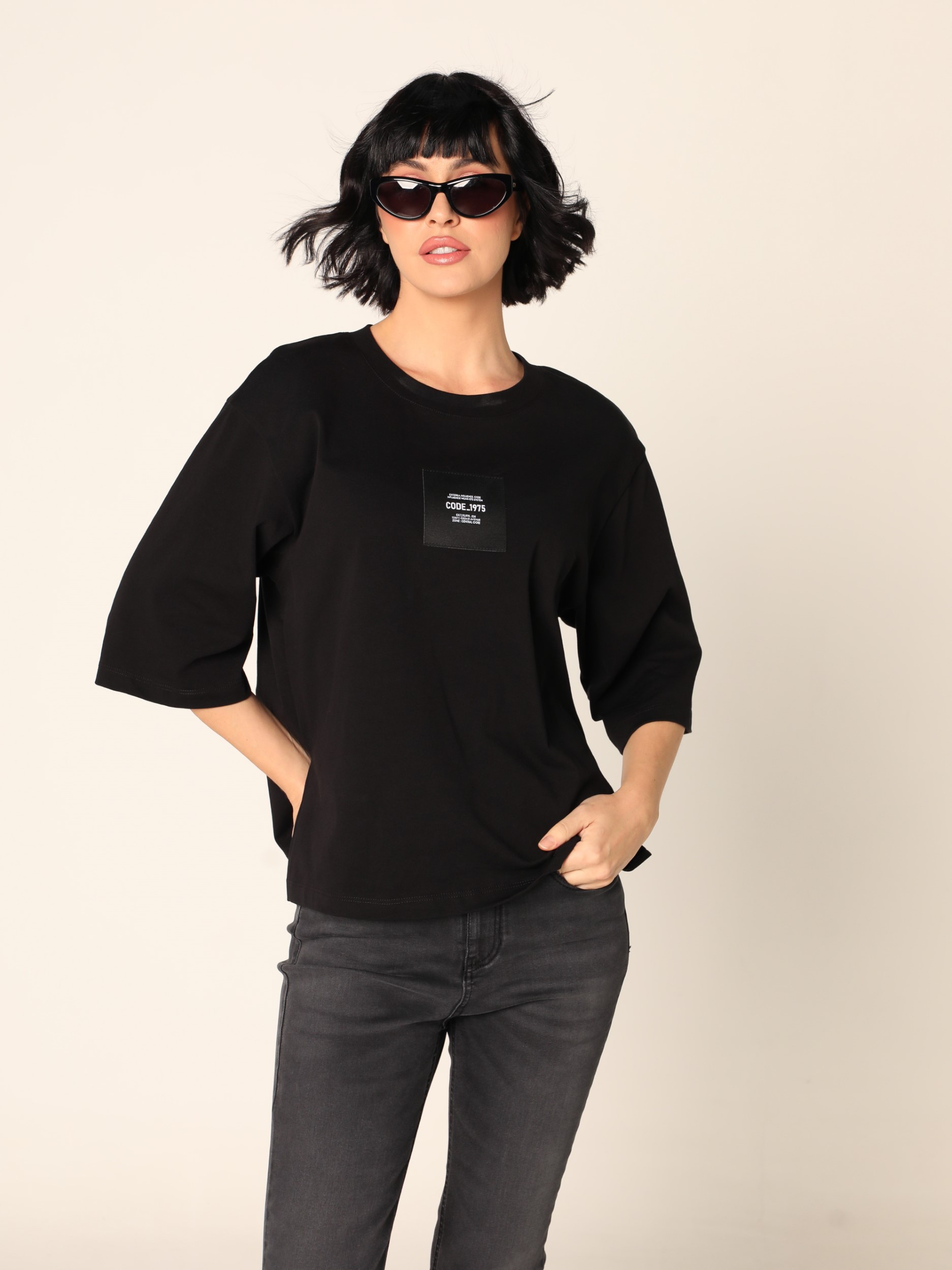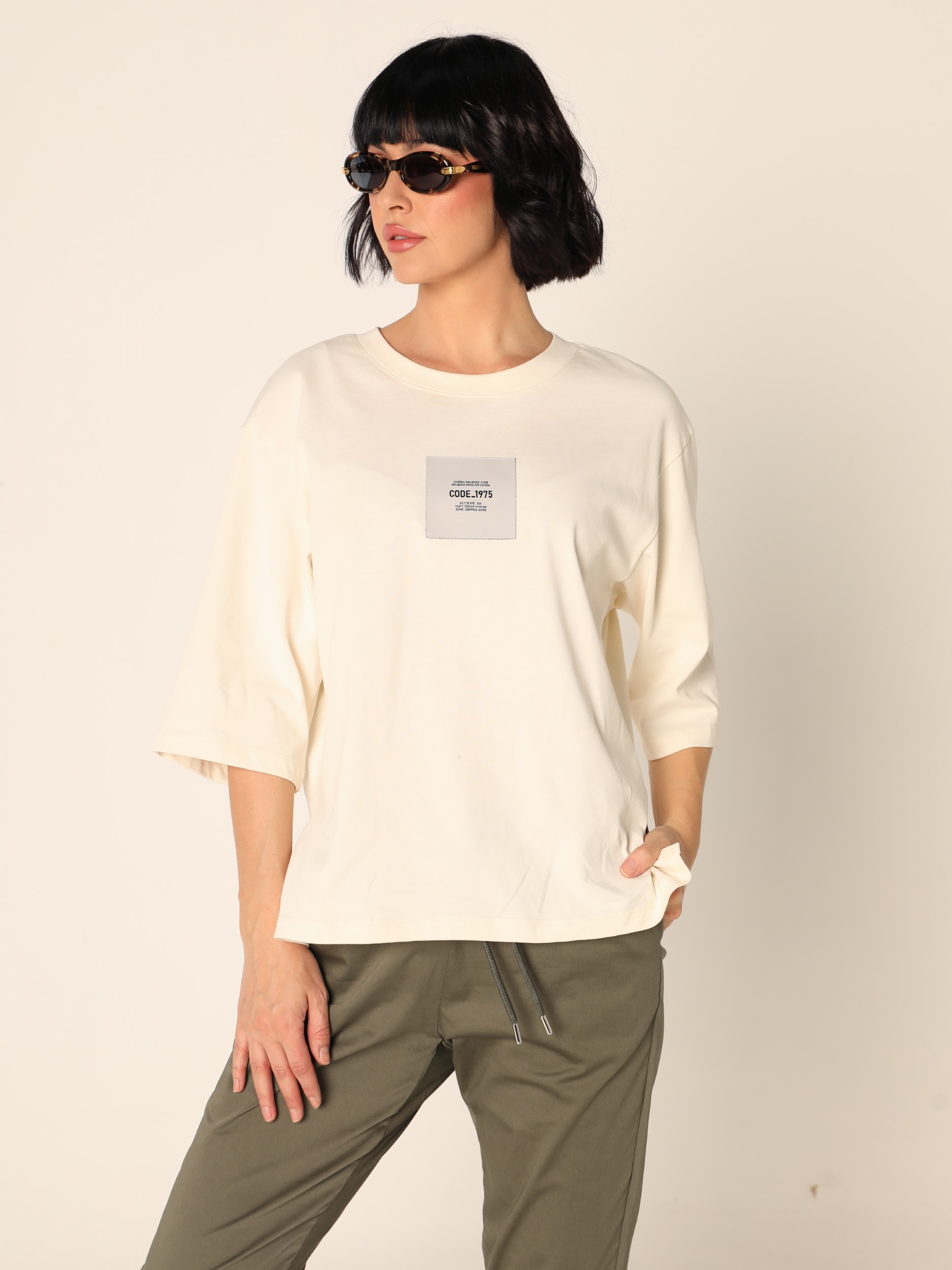 Duks sa okruglim izrezom i spuštenim ramenima, širokih rukava dužine 3/4. Na prednjoj strani ima etiketu na grudima. Završava se ravnim rubom sa diskretnim bočnim prorezima.