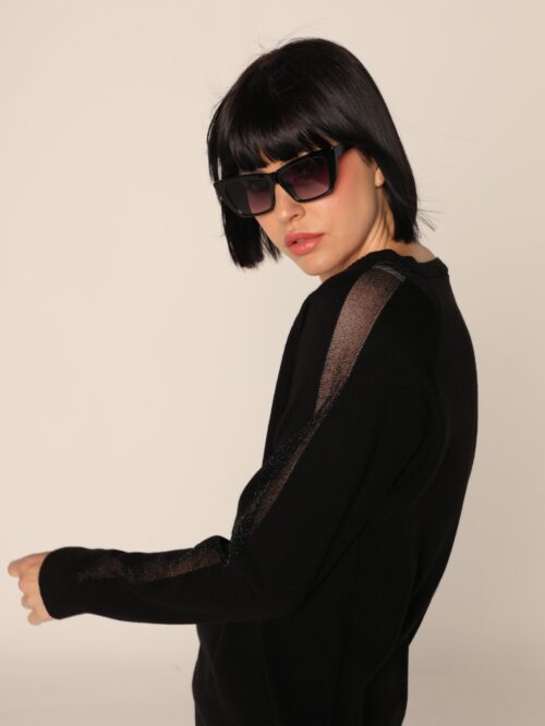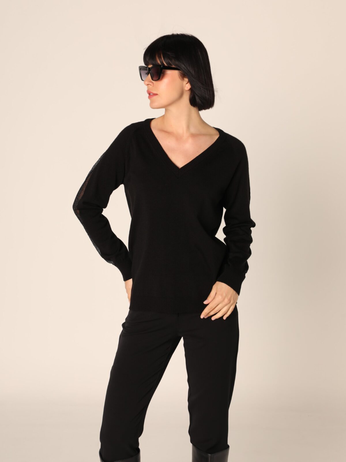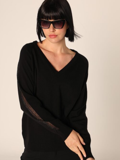Džemper sa V-izrezom i dugim rukavima. Na rukavima se nalazi diskretan sjajni detalj u vidu providne trake duž cele dužine. Model ima opušten kroj i ranfle na rukavima i donjem rubu.