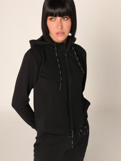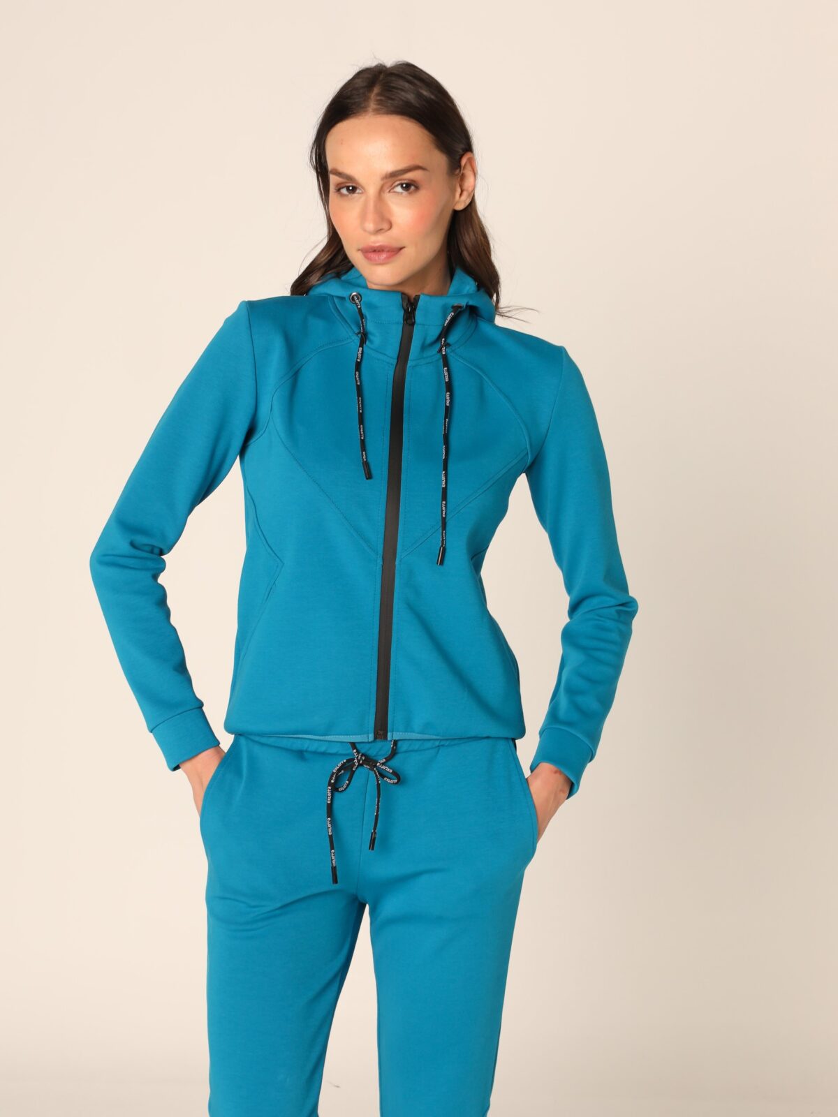 Duks sa rajsferšlusom, visokom kragnom, učkurom sa štampom i bočnim džepovima. Model sa ukrasnim šavovima na prednjem delu.