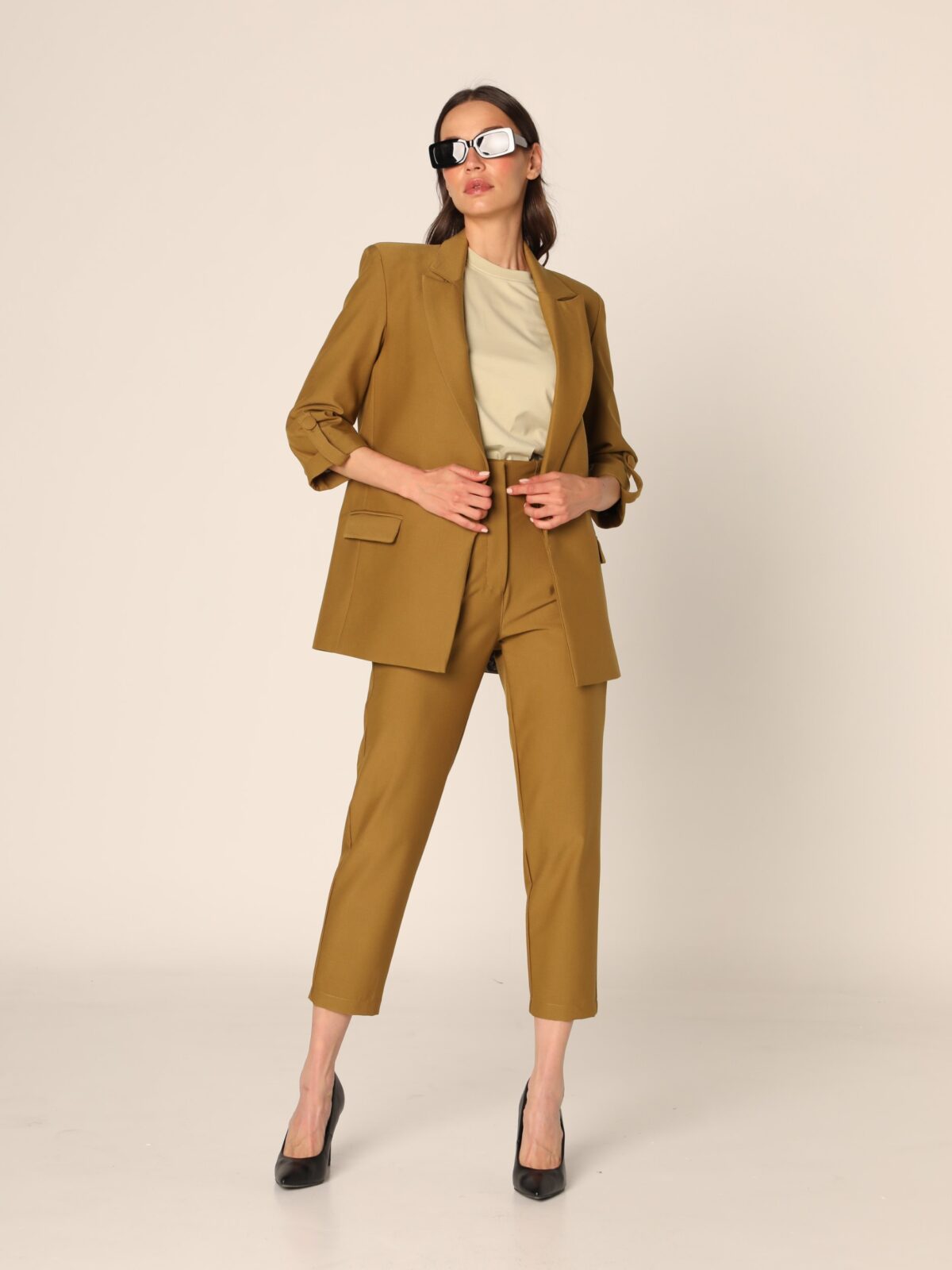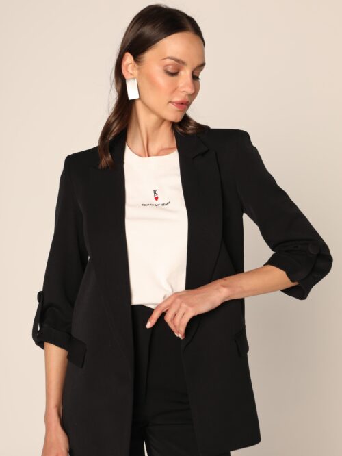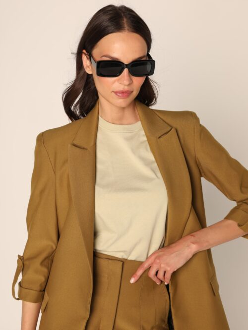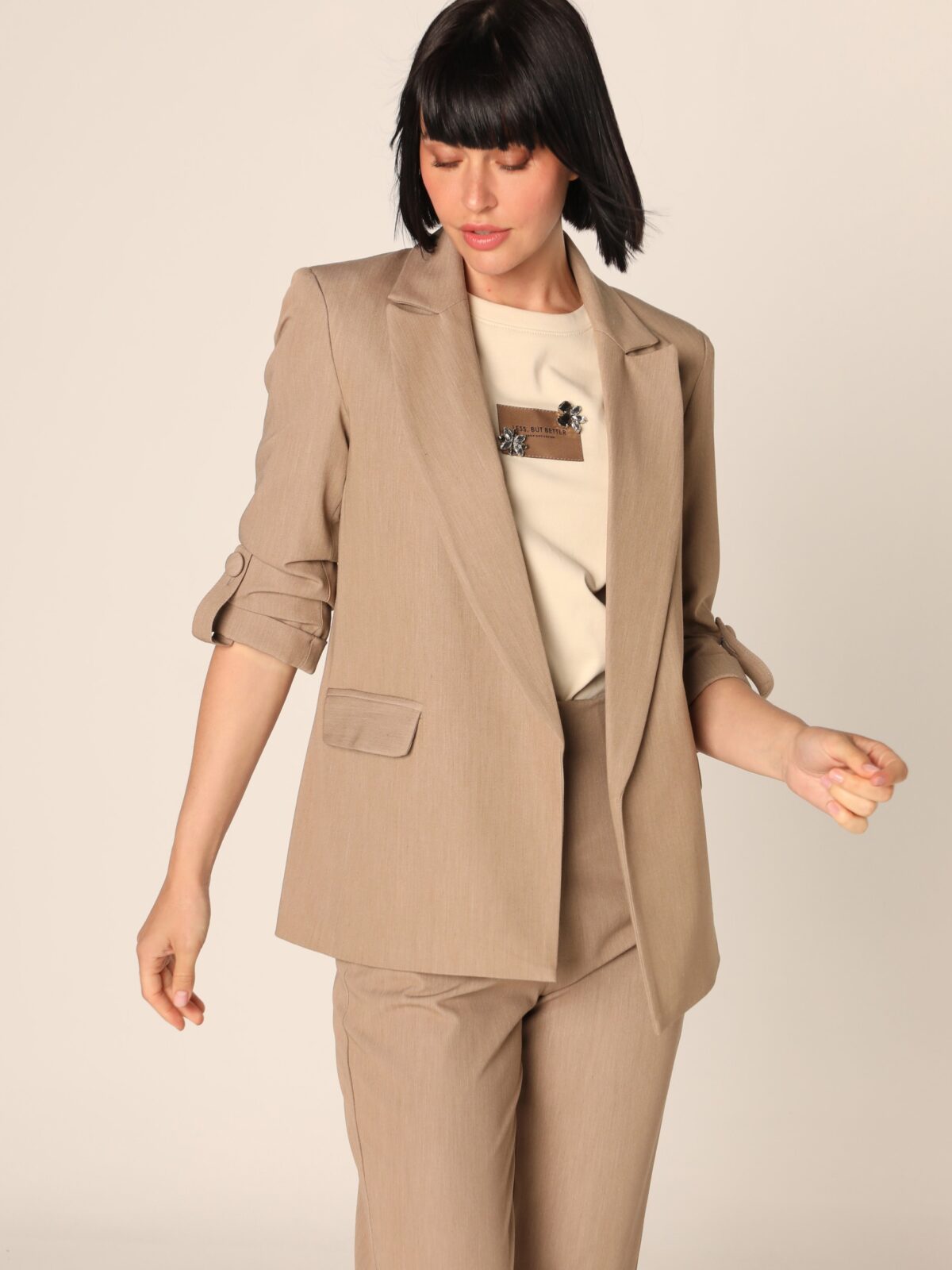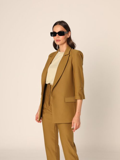Duži sako sa naramenicama i dugim rukavima sa podešivačima. Dva dekorativna bočna džepa.