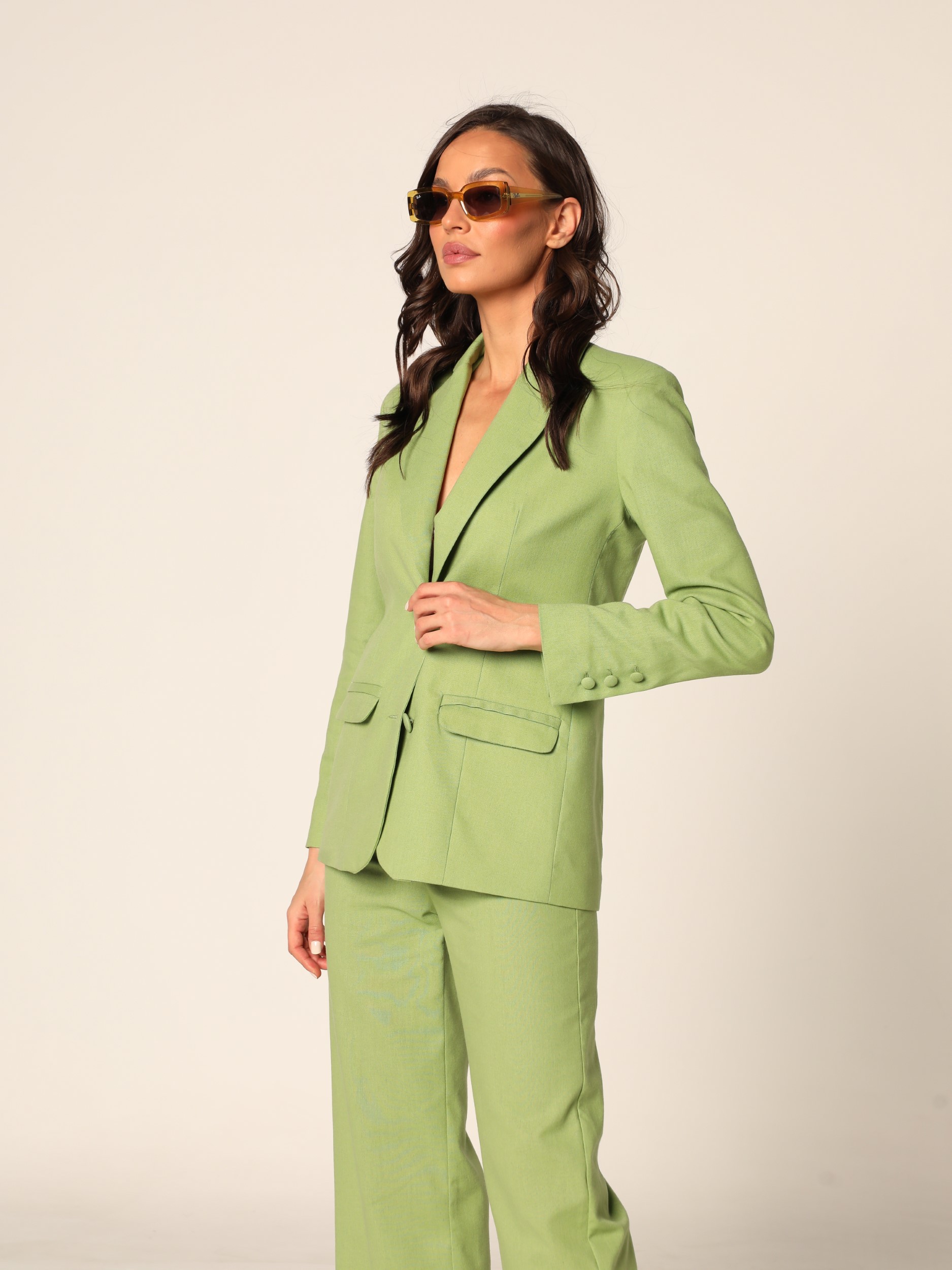 Sako ravnog kroja sa klasičnim reverima, dugmadima na prednjem delu i ušivenim dekorativnim džepovima.